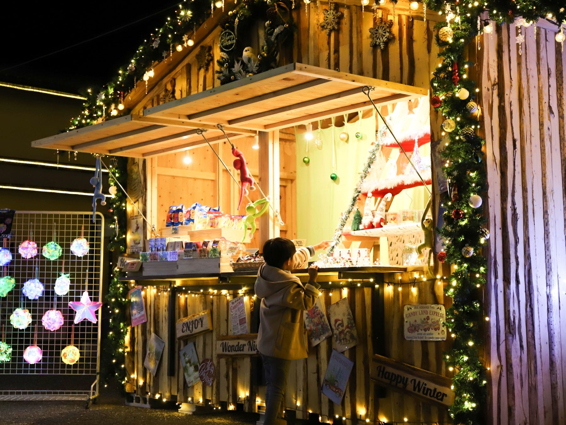 可愛らしく装飾されたクリスマスマーケットの小屋では、焼きたてピザやラクレットチーズをかけた自家製フランクフルト、温かいスープ、クリスマスギフトにもピッタリな小物の販売を行っています。