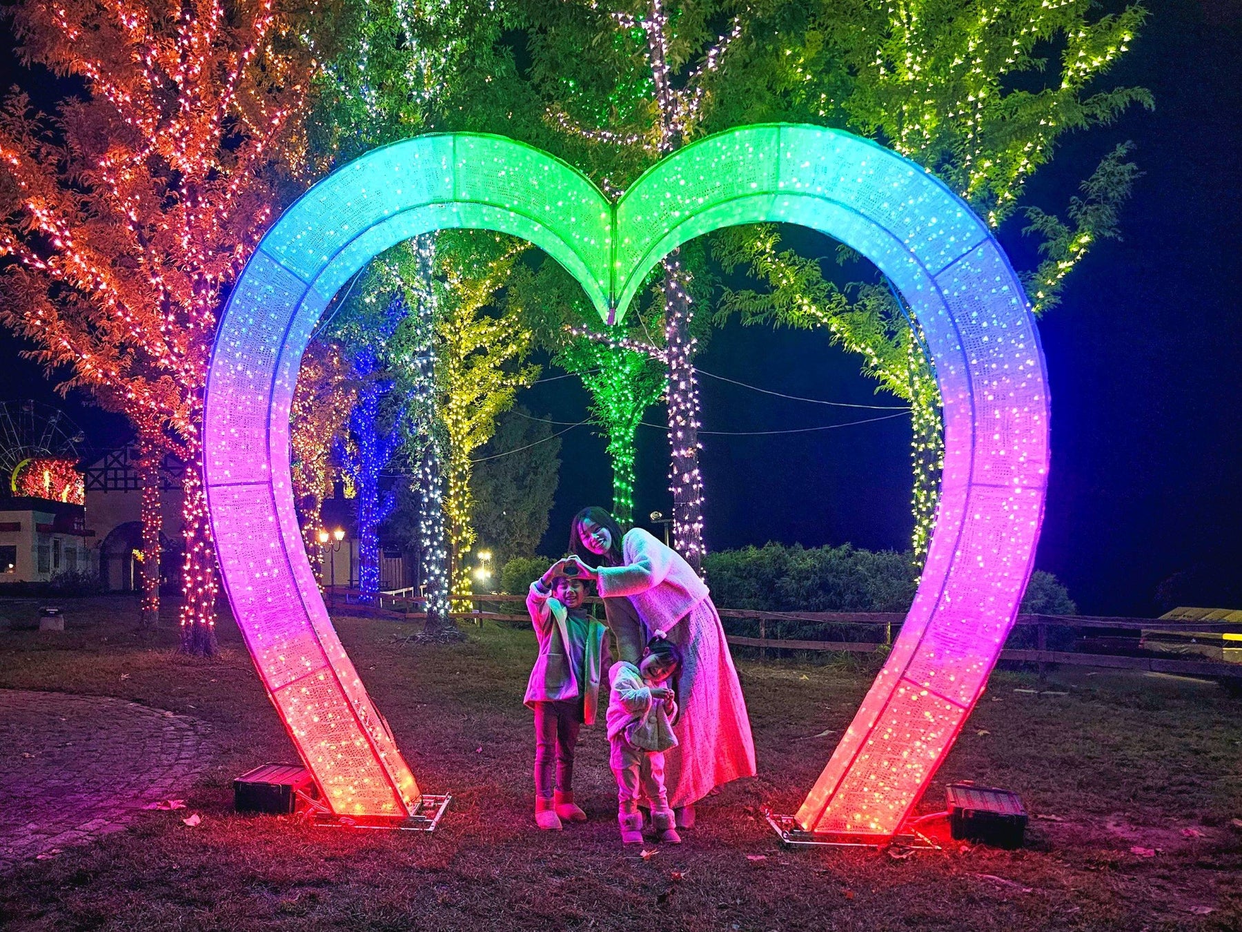 大きなハートオブジェのフォトスポットは、赤色やピンク色、虹色など次々と色が変化し、カップルや友達、家族と一緒に撮影するのにぴったりの場所です。