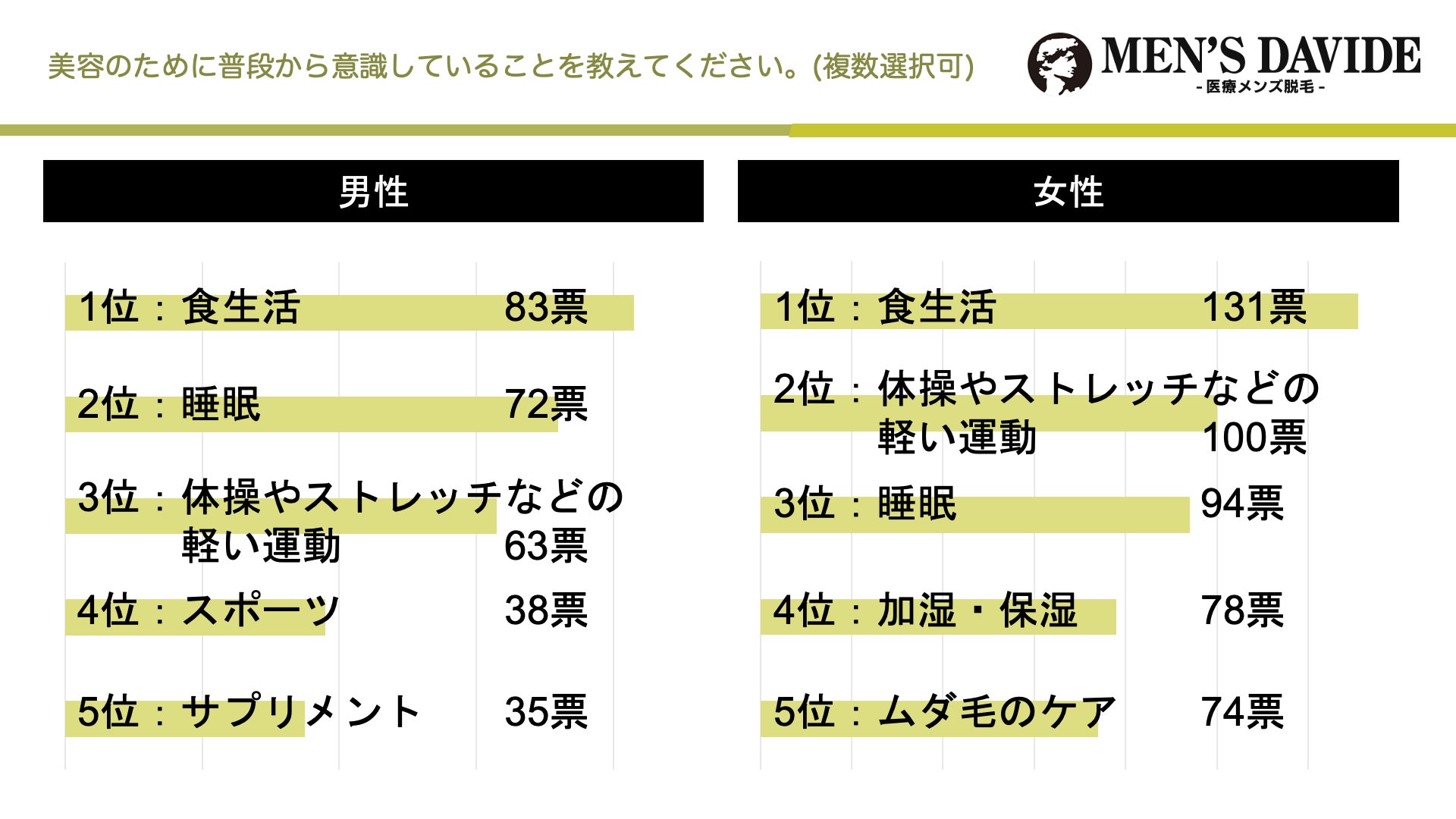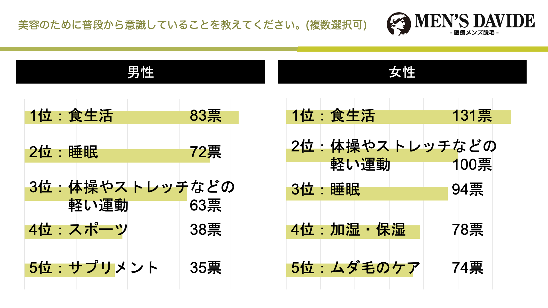 ■美容のため「食生活」「睡眠」への関心は男女共通。男性は運動意識が高めか