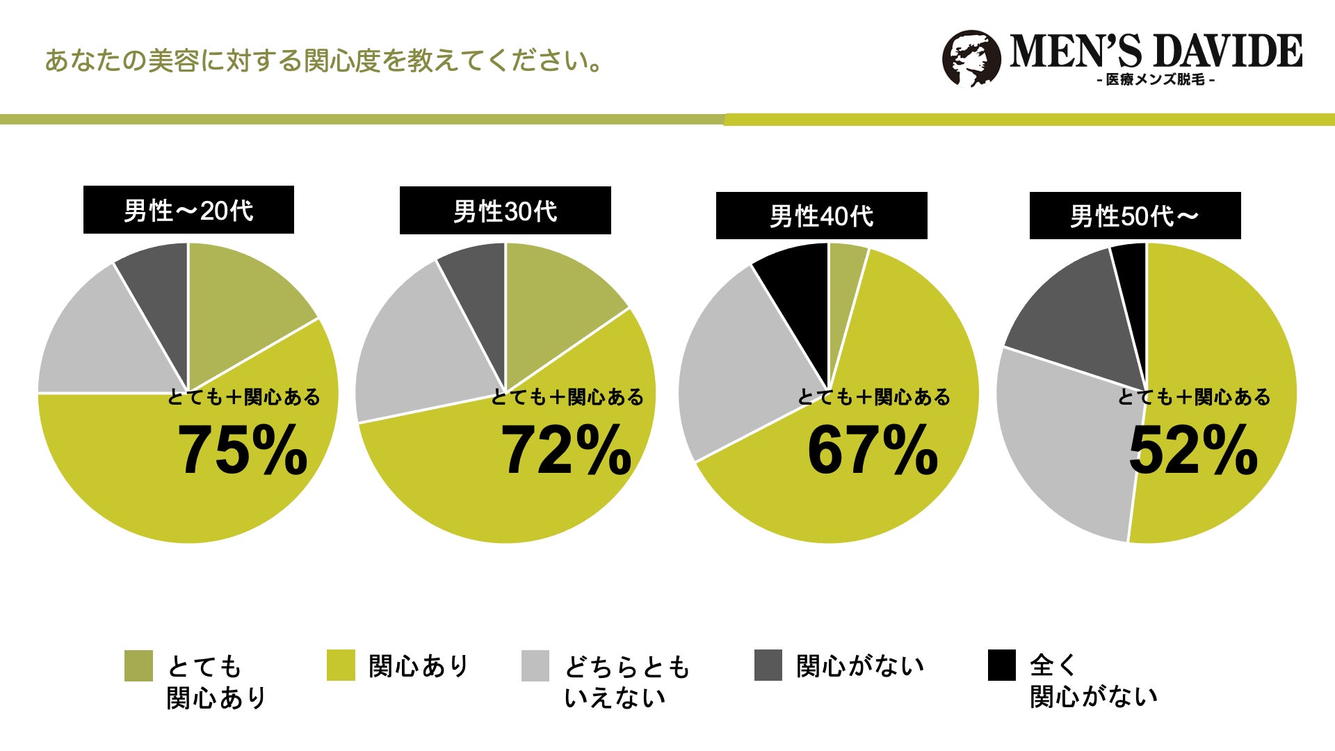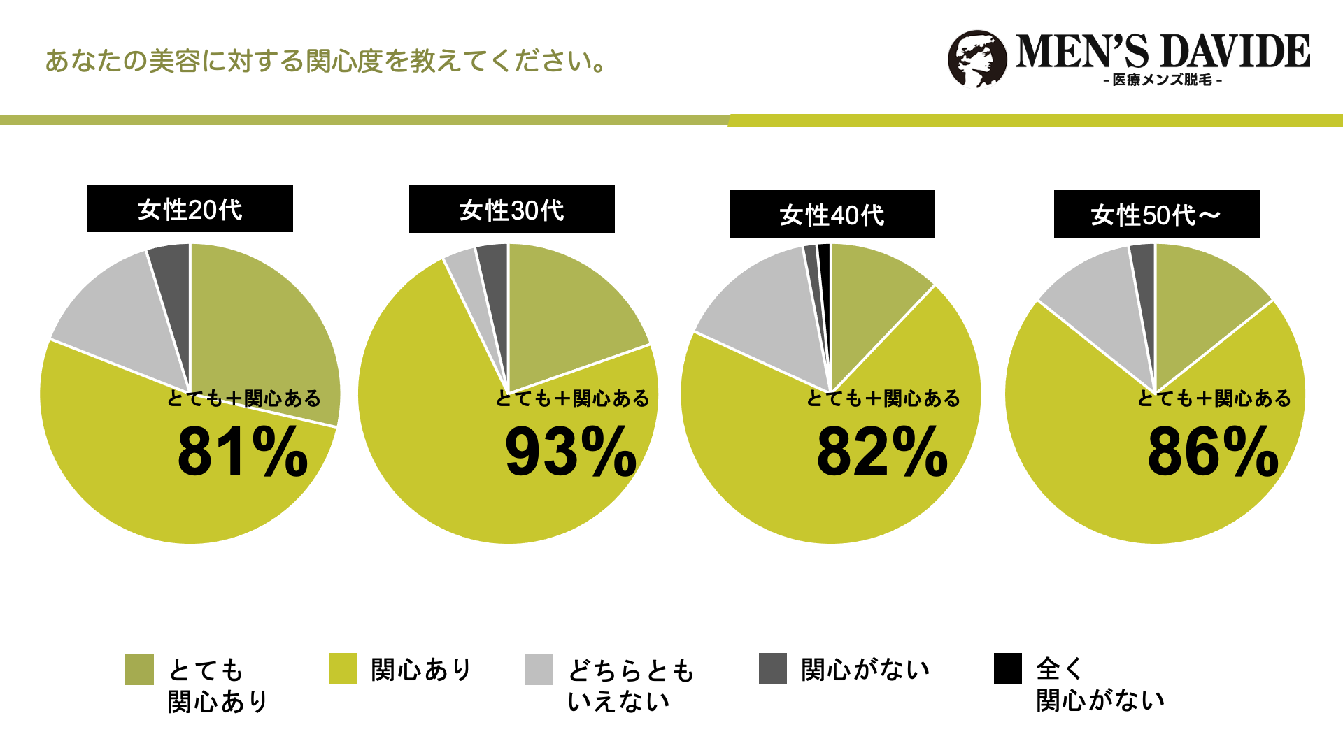 依然として男女の美容への関心には差が見られる結果となりました。ただし年齢を重ねるごとに、若い時に対策しておけば…若い時に脱毛しておけば…といった後悔の声が聞かれるのは、男女共通のようです。今はまだいいかと考えている方も、歳を重ねてからでは後戻りできない部分も多いのが美容関連。気になる美容のお悩みがあれば、早めに対策をとるのもおすすめです。