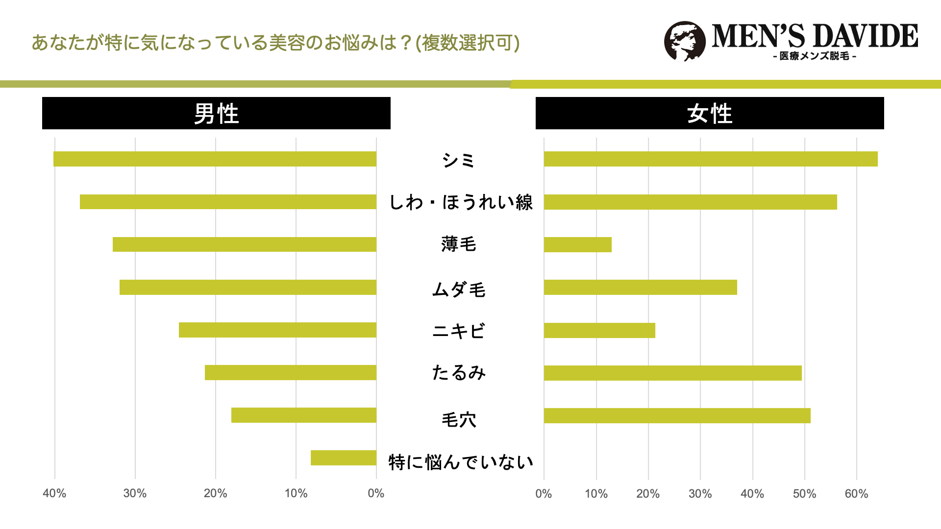男性はヒゲや肌荒れ、女性は加齢による肌の衰えが悩み。脱毛時期の遅れを後悔する声も多い