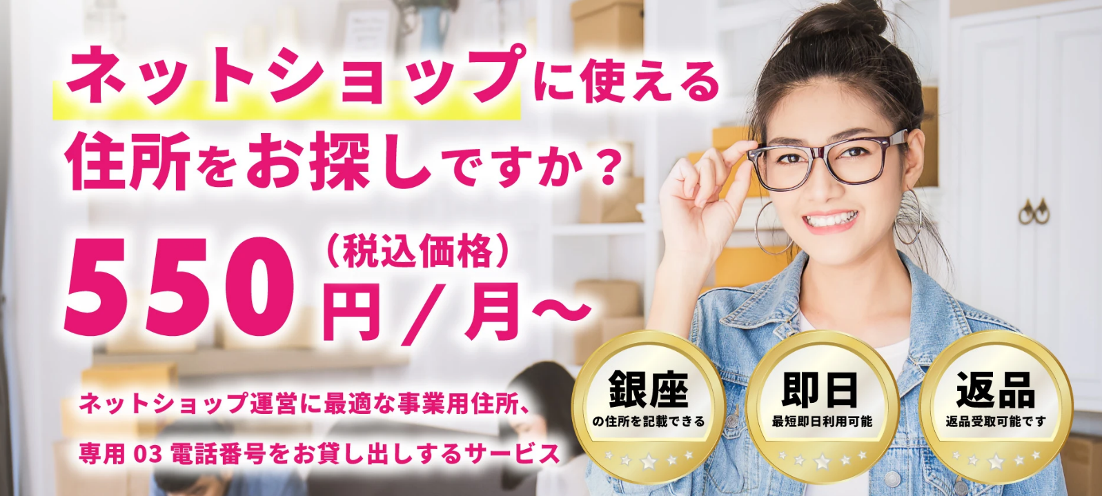 ネットショップの「特定商取引法に基づく表記欄」に記載できるご住所が、ランチ1回分以下の格安価格でご利用いただけます!