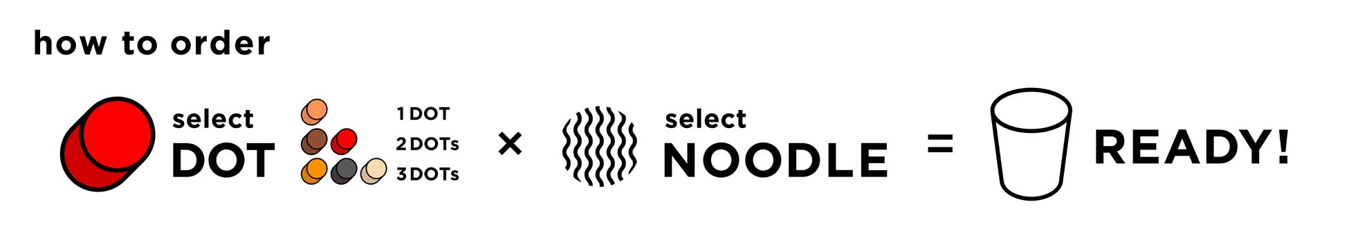 まずは10種類のカラフルな“スープDOT”からお好きなものを1~3つピックアップ。そこに、ジャンルを問わずにラインナップした3種類の麺と、お好みでコンディメントバーに用意した5種類のフレーバーオイルを掛け合わせてヌードルが完成。どんな組み合わせでも美味しく食べられて、ジャンルや国境を超えた自分だけの美味しさを選べます。