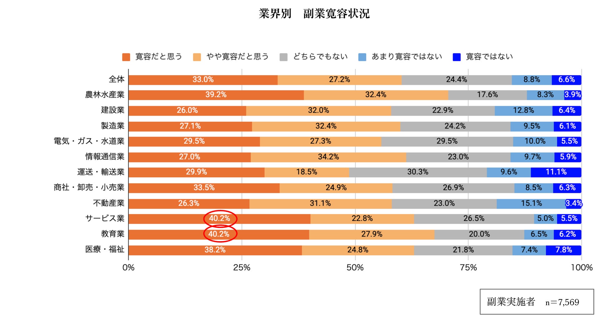 業界別の、職場としての副業許容度を調査した。農林水産業、サービス業、教育業、医療・福祉がいずれも「寛容だと思う」が40%前後と高く、それ以外の業界は30%前後に止まる。特に建設業、不動産業は26%前後と最も低い。