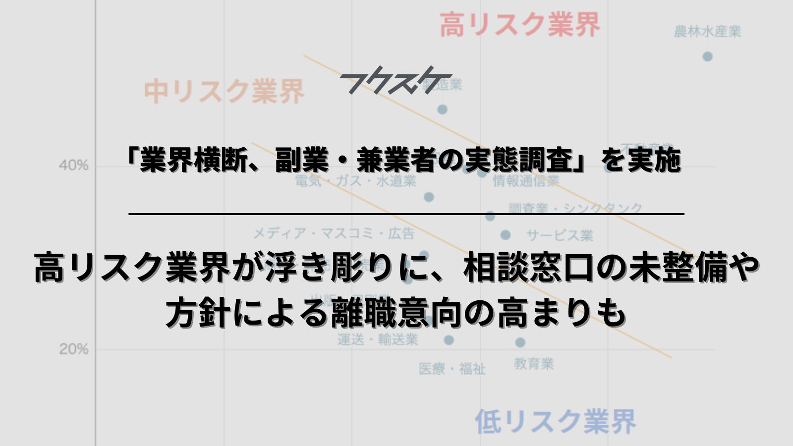 副業事故防止・監査プラットフォーム「フクスケ」を提供する株式会社フクスケ(本社:東京都千代田区、代表取締役:小林 大介、以下「フクスケ」)は、「業界横断、副業・兼業者の実態調査」を実施しました。働き方の多様化が進む一方で、副業・兼業に関する実態と課題は十分に把握されていないのが現状です。本調査では、業界を超えて副業・兼業の現場に起きている問題を明らかにしました。特に、副業リスクが高い業界の存在、企業の副業方針による離職検討率の上昇、副業に関する相談窓口の未整備といった深刻な課題が浮き彫りとなりました。