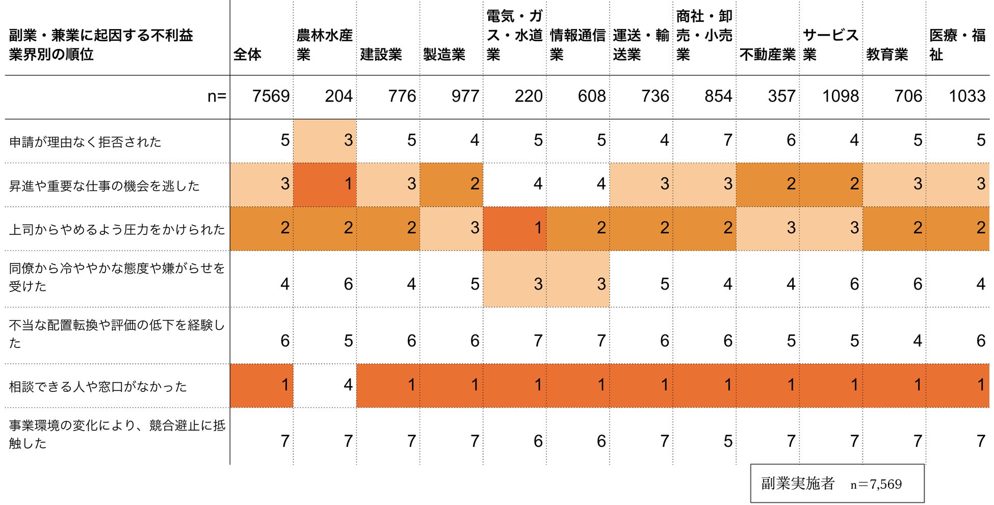 業界共通してに「相談できる人がいない」「上司からの圧力」「昇進や仕事の機会を逃した」が上位に昇った。一方で農林水産業では「申請の拒否」、電気・ガス・水道業、情報通信業では「同僚からの嫌がらせ」が上位に入るなど、違いが見られた。副業に関する窓口、制度の未整備による不利益が見られる。