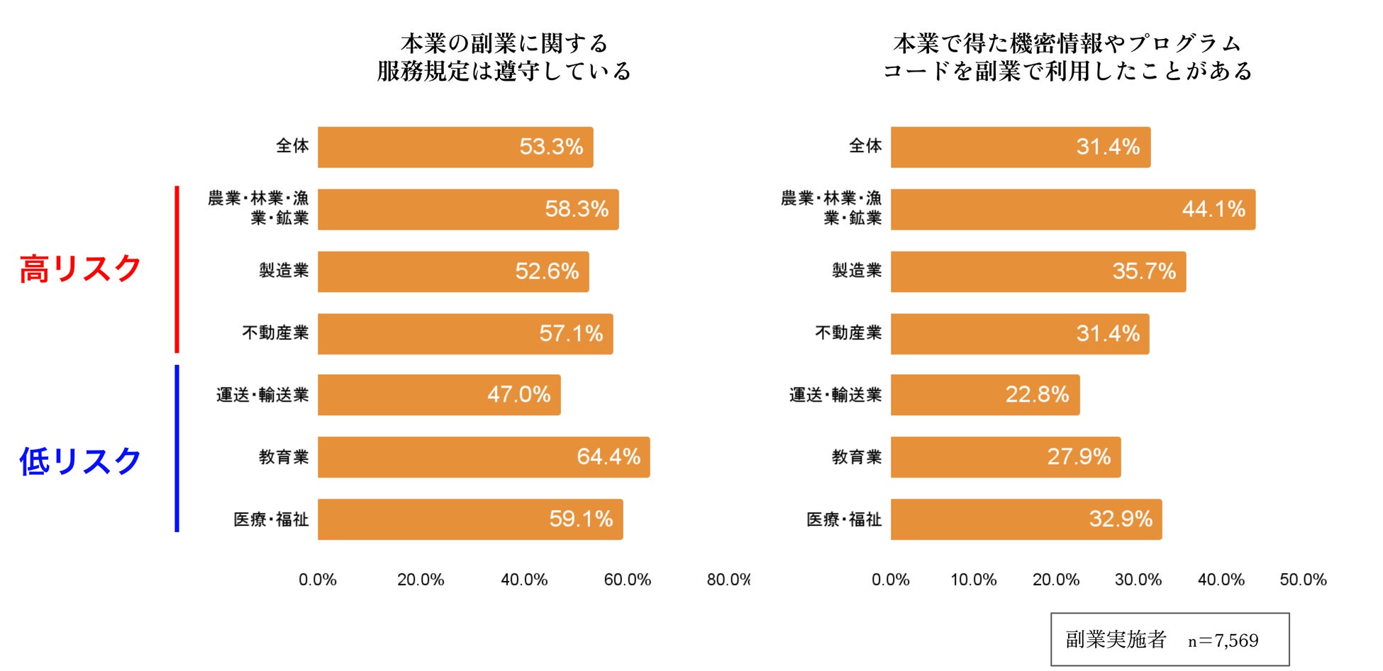さらに副業率とトラブル発生率を掛け合わせた「副業リスク総量」を算出したところ、農林水産・不動産・製造が高リスク、教育・医療・福祉が低リスクに分かれる三層構造が浮かび上がりました。また、競業や情報流出の懸念が高い業界ほど「服務規定は守っている」と認識しながら機密情報の流用が確認されるなど、規範意識と実践の乖離も見受けられました。