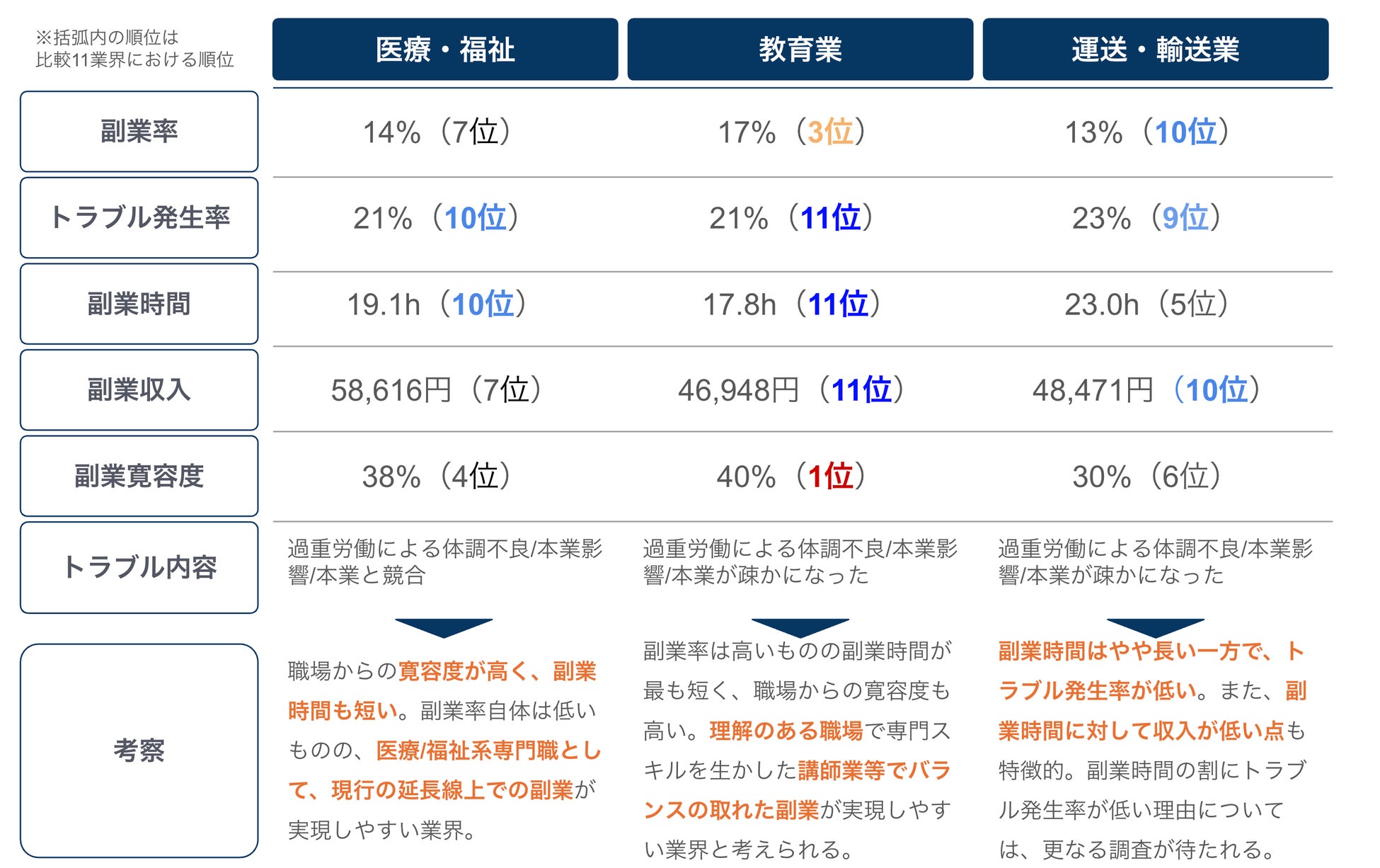 副業率が最も高い農林水産業は、トラブル発生率、副業時間でもトップという結果だった。業界が副業に対して寛容、副業時間や収入が多い。許容されるが故に、結果として超過労働が発生しやすいと考えられる。不動産業界は、副業時間の割に収入が多い業界である一方、本業での情報を自身の不動産ビジネスに活用するなどのトラブルが発生する傾向にある。次に、製造業はトラブル発生率が2番目に高い。副業も同じく製造系の肉体労働が一定存在し、負担が大きくなりやすい可能性がある。
