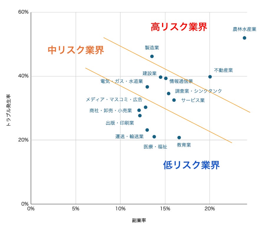 「副業率」、「トラブル発生率」の2軸をかけ合わせると、高リスク業界、中リスク業界、低リスク業界に分類が可能。