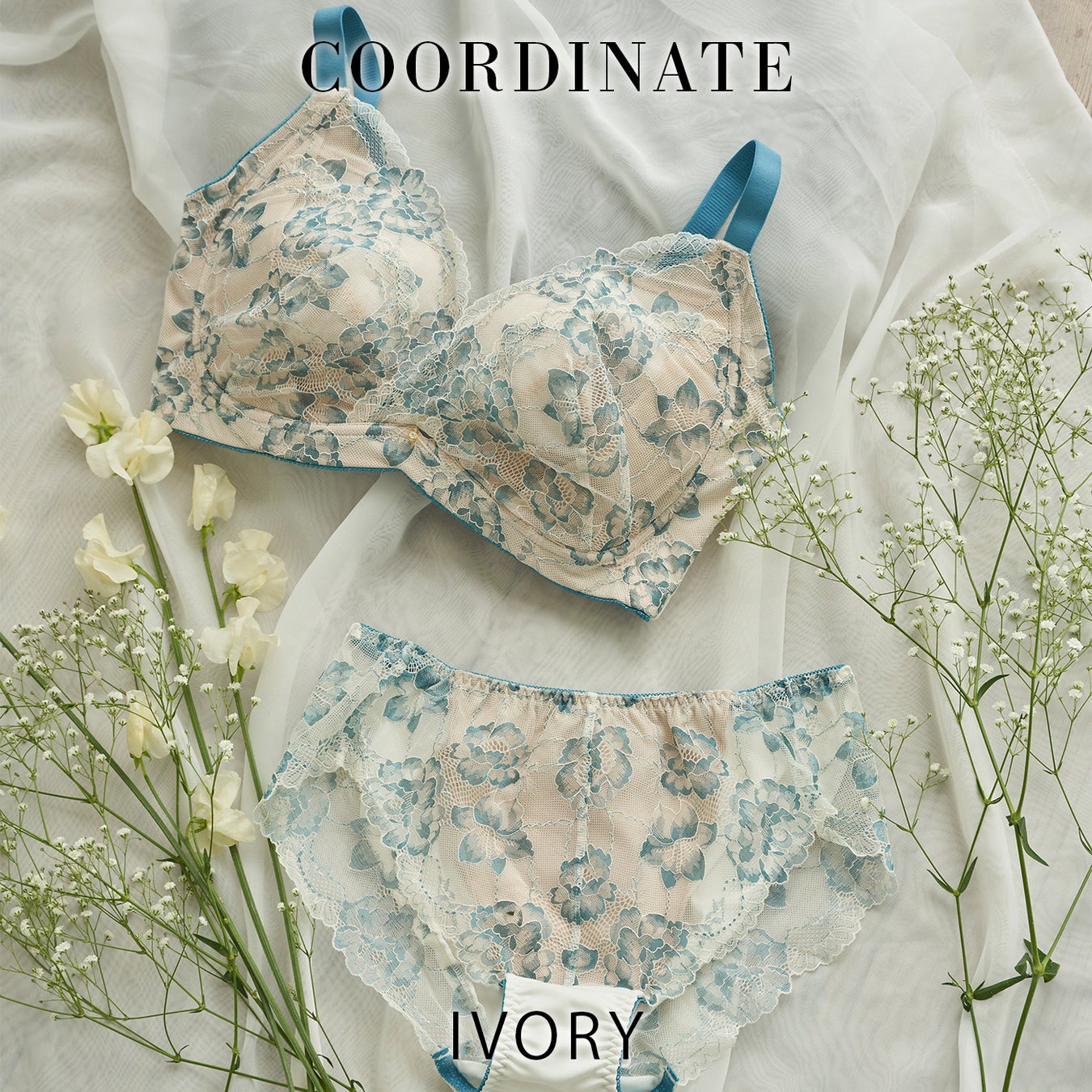 ターコイズの花とアイボリーのバイカラーで爽やかな印象に。