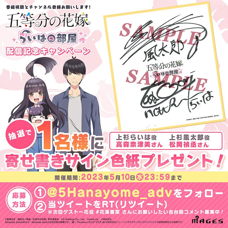 4月15日(土) に配信された、「らいはの部屋」第2回に出演された、上杉らいは役:高森奈津美さん&上杉風太郎役:松岡禎丞さんの寄せ書きサイン色紙が当たるTwitterキャンペーンを開催中!