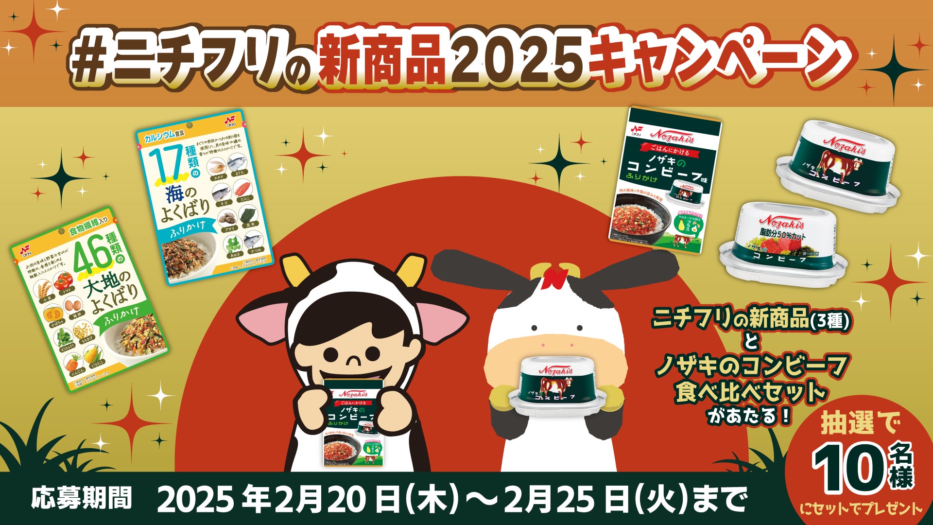 「ノザキのコンビーフ味ふりかけ」と「ノザキのコンビーフ」が食べ比べできる!Xにて「ノザキのコンビーフ味ふりかけ」を含むニチフリ食品の新商品3種とノザキのコンビーフのセットが当たる「#ニチフリの新商品2025キャンペーン」を開催します。