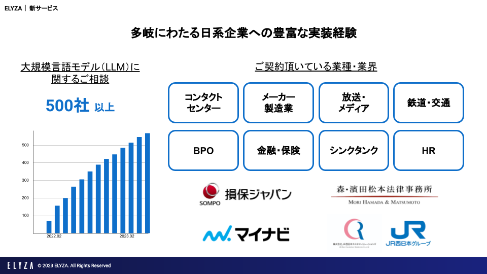 ELYZAはホワイトカラー業務のDX推進を掲げ、これまでに多くの日系企業の課題に向き合ってきました。累計500件以上の問い合わせをいただいており、実際に大手企業への言語AIの導入実績も複数あります。