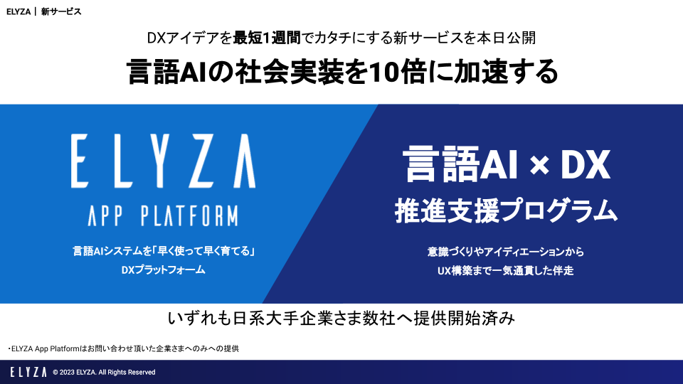 本日、ELYZAはDXアイデアを最短1週間でカタチにする新サービス「ELYZA App Platform」および「言語AI×DX推進支援プログラム」を公開いたします。いずれも一部の数社の大企業に限定的に提供をしてきましたが、本日より公開サービスとして利用希望の受付・提供を開始します。