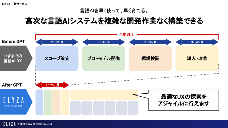 そのために、本日より、アイデアを最短1週間でシステムとしてカタチにできる言語AI活用アプリプラットフォーム「ELYZA App Platform」を提供致します。ELYZA App Platformを利用することで、従来、現場導入まで1年程かかっていた言語AIシステムの開発・改善サイクルが最短1〜2ヶ月に短縮されることが期待されます。