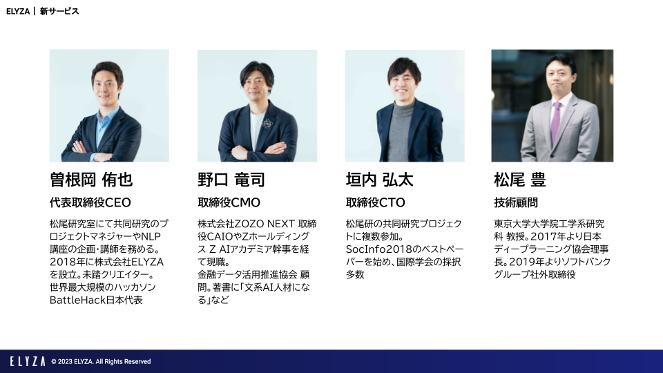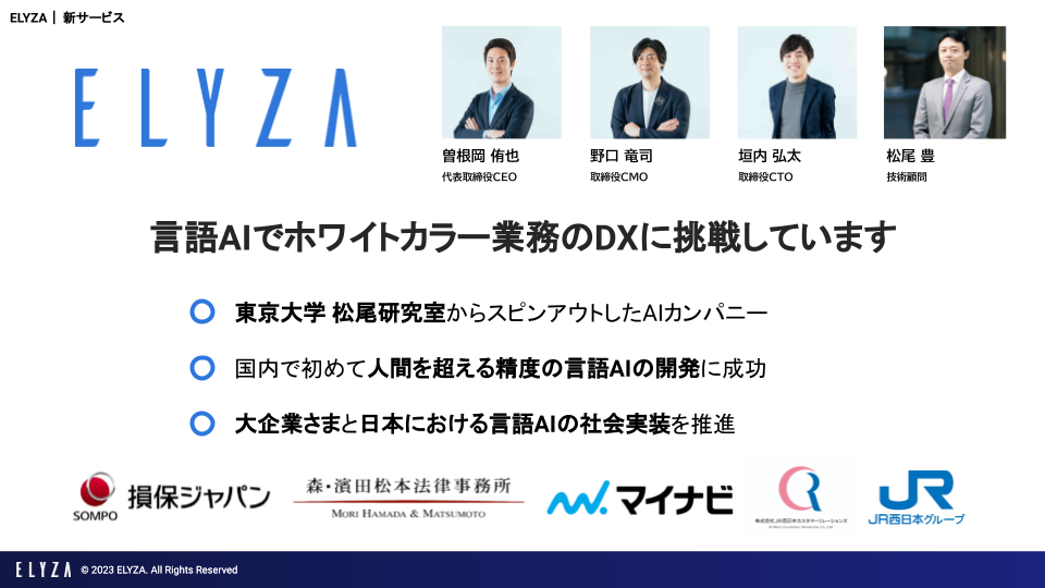 ELYZAはAI領域に強みを持つ東京大学・松尾研究室発のAIスタートアップです。創業以来、日本語に特化して大規模言語モデルの研究開発をいち早く行い、日本語AIエンジン「ELYZA Brain」の開発に成功しました。