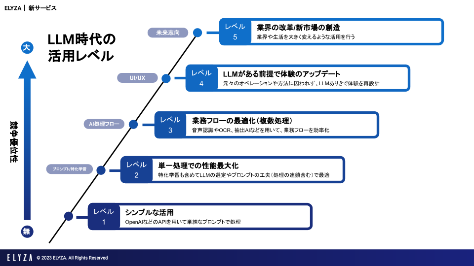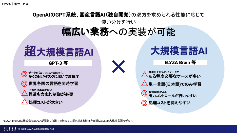 一方で、複雑なAI処理を元にした業務フローの最適化、言語AIがある前提での体験設計などは多様な知識と実装経験が必要になると考えております。ELYZAはChatGPTが登場する以前から培ってきたスキル・ノウハウ・モジュールをフルに活用して企業における言語AIの活用を支援して参ります。