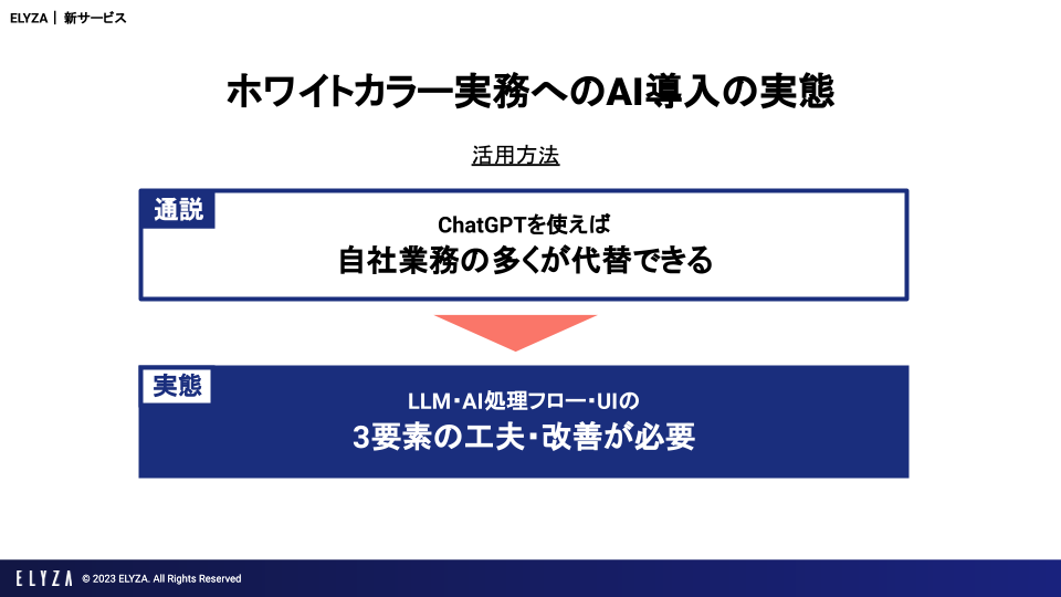 はじめに、サービス提供の背景として、ELYZAの今までの活動を通じて明らかになったことをご共有します。