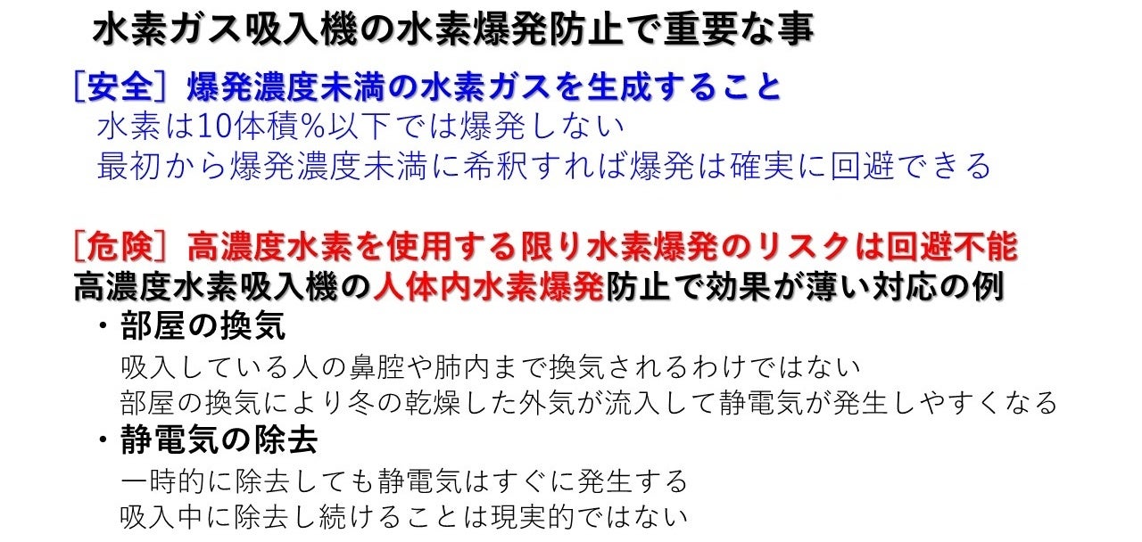 例えば、乾燥した冬に、高濃度水素吸入器の爆発のきっかけとなる静電気を除去し続けることは現実的ではありません。また、高濃度水素を吸入している限り、どんなに室内を換気しても、吸入している使用者の鼻腔や肺の中まで換気しているわけではないため、人体内の水素濃度が爆発濃度に至る可能性を排除することはできません。加湿もまた、人体内という高湿環境下で事実として爆発事故が起こっている以上、意味ある対策ではありません。