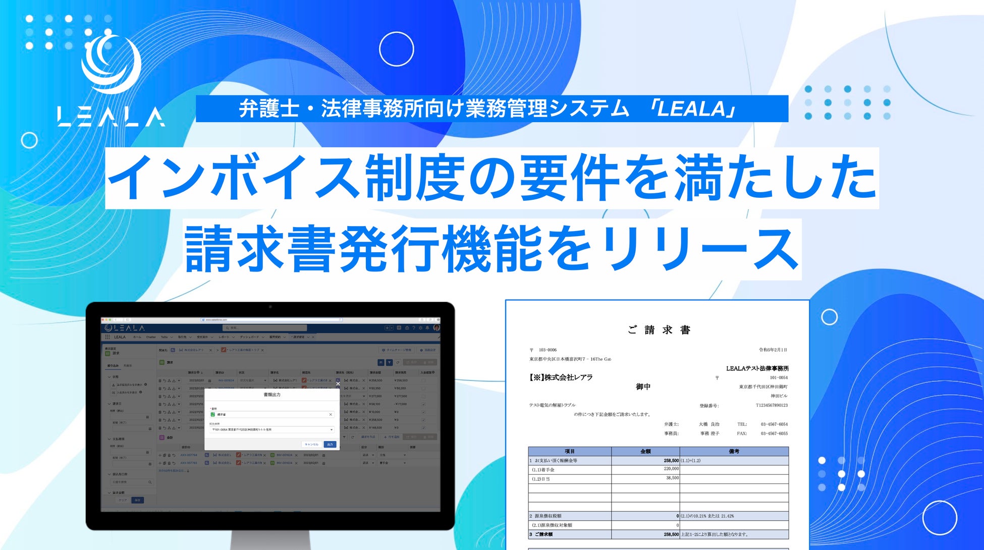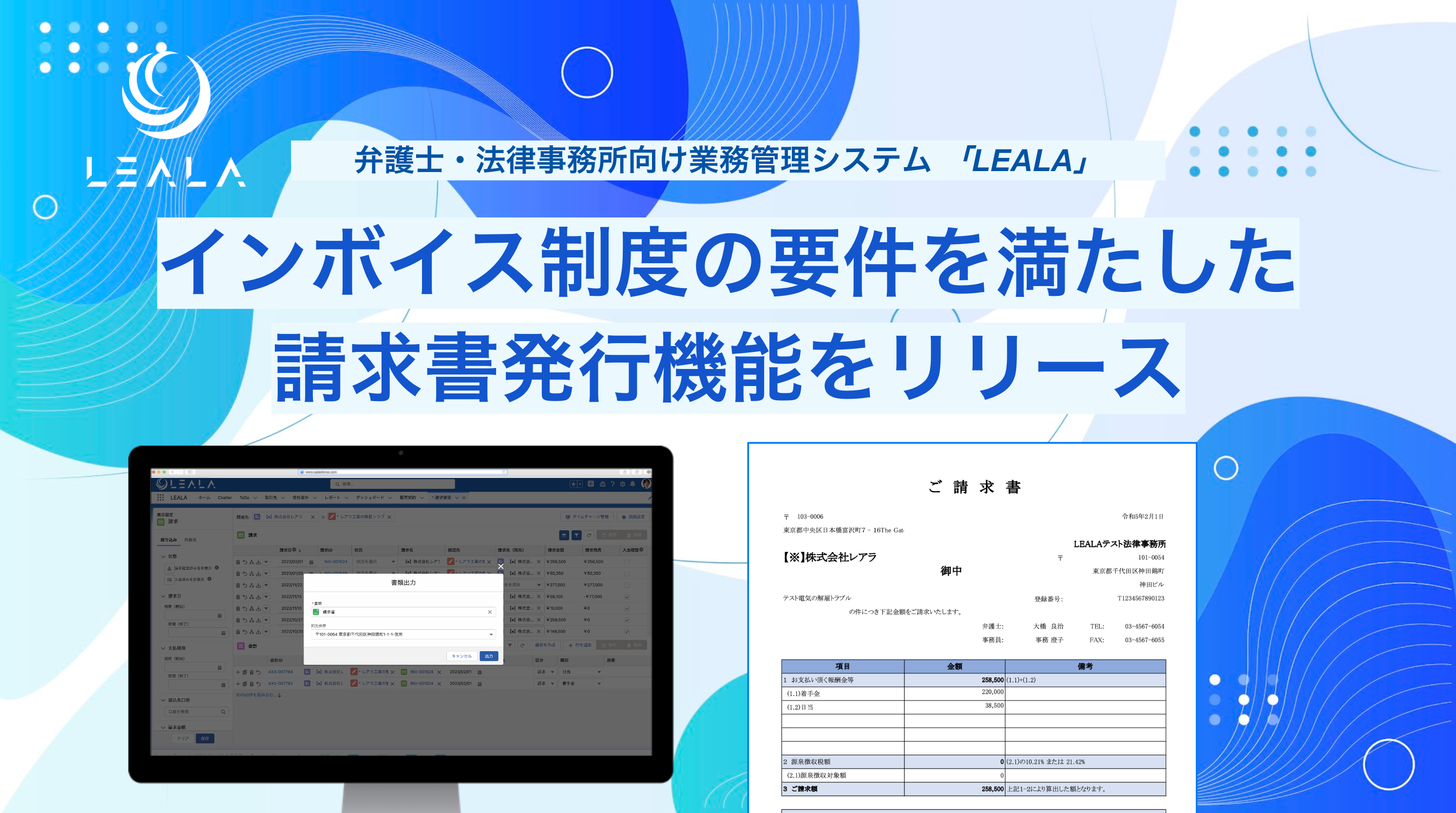 株式会社レアラ(本社:東京都中央区、代表取締役:林 和成)は、法律事務所におけるインボイス制度への対応をご支援すべく、弁護士・法律事務所向けクラウド業務管理システム「LEALA」にて、インボイス制度の要件を満たした請求書発行を可能にする新バージョンをリリースいたしました。