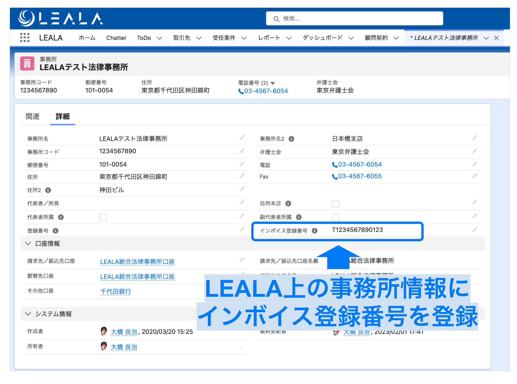 ⑴ 登録番号は、LEALA上の事務所情報にインボイス登録番号を登録することで、請求書出力時に差し込みが可能です。