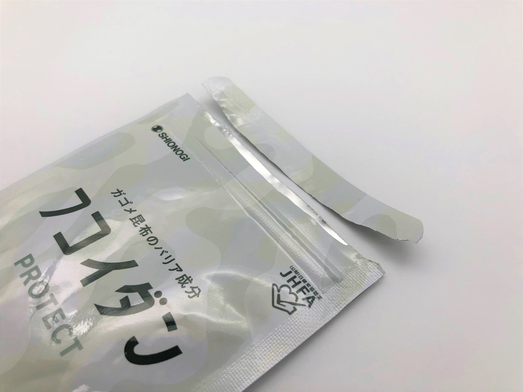 パウチのパッケージは開口部に段差をつけることで、つかみ部を設け、袋の口元が開封しやすい仕様となっています。