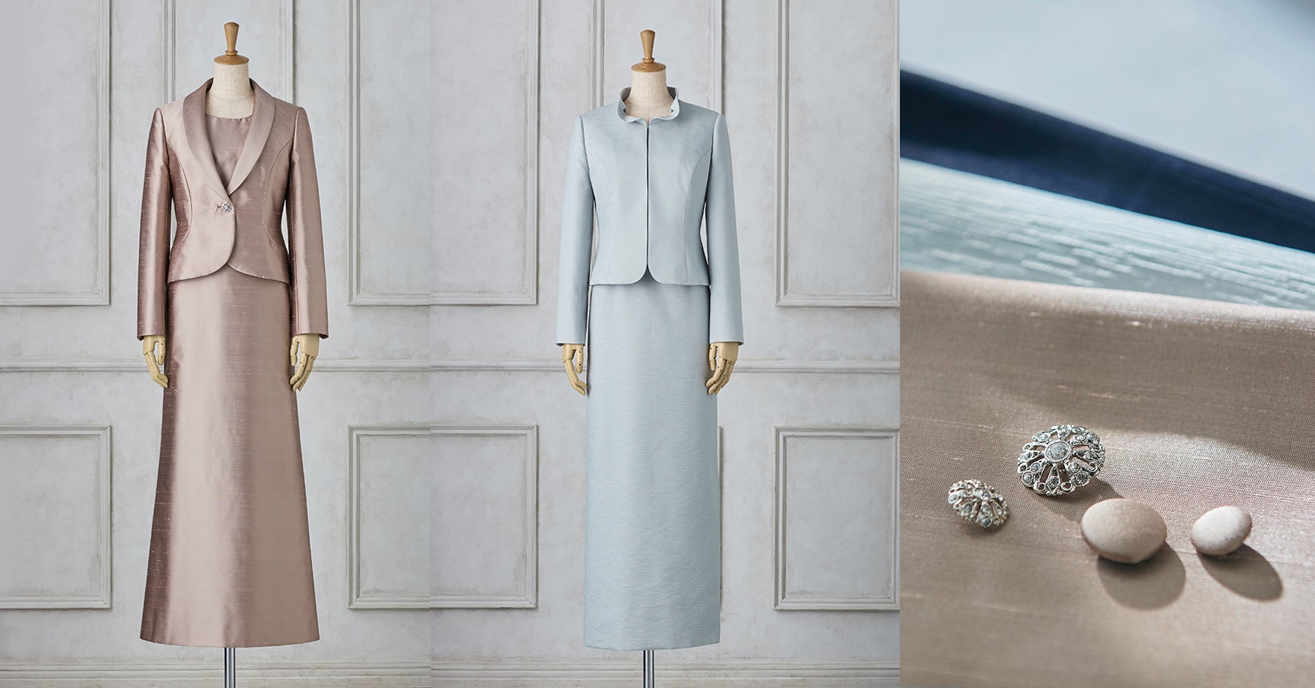 モデルAはシルク100%のシャンブレーシャンタンを使用。優しいラウンドを描く衿デザインのジャケットとドレスの優美なフレアシルエットを引き立てる、深みのある光沢が魅力です。