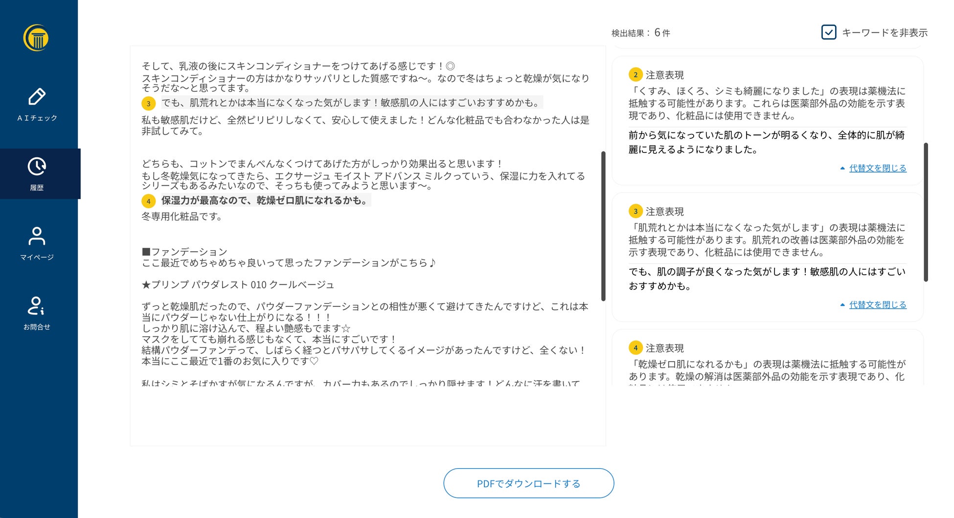 自然言語処理技術を用いた文章解析により、2分程度で薬機法に関わる文章を検知いたします。監査時間の短縮と人間の工数を削減します。 -