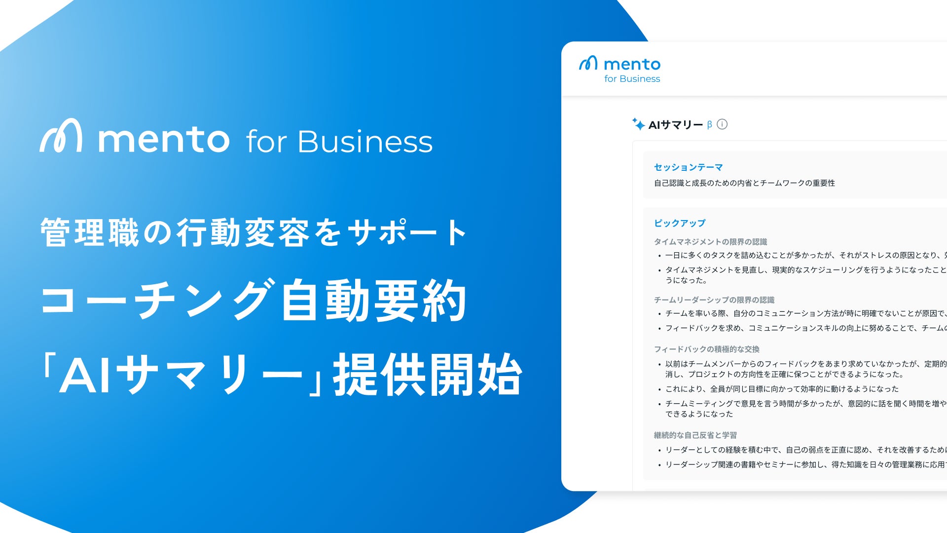 AIによる自動要約で、忙しい管理職のコーチングの振り返りと行動変容を促進。「mento for Business」にて、「AIサマリー」提供開始