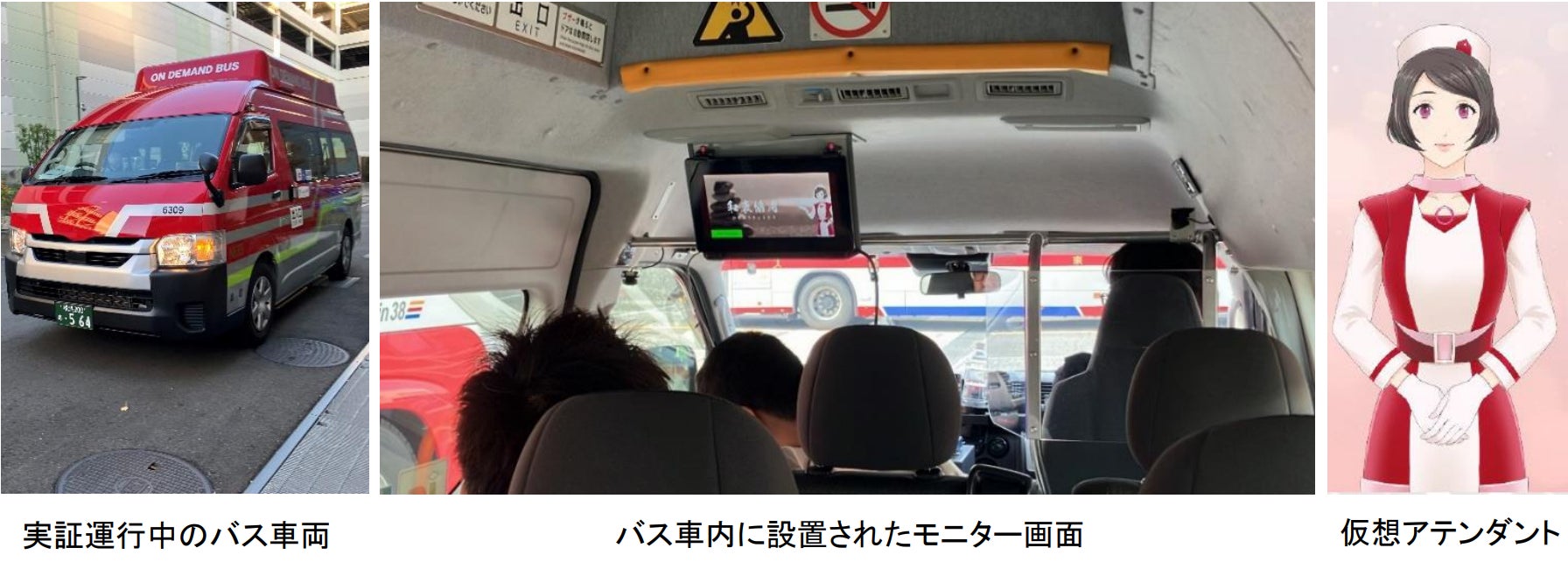 このサービスは、仮想アテンダントがバス車内に設置されたモニターを通じて、天候情報や車両挙動(発車・停車、カーブ走行など)に基づいた乗客向け車内アナウンスを行います。また、車両位置に応じたスポット情報や、行政・地域・特売情報も提供し、利用者の利便性とホスピタリティの向上を検証します。実証実験は2024年11月25日から2025年3月31日まで実施します(※3)。