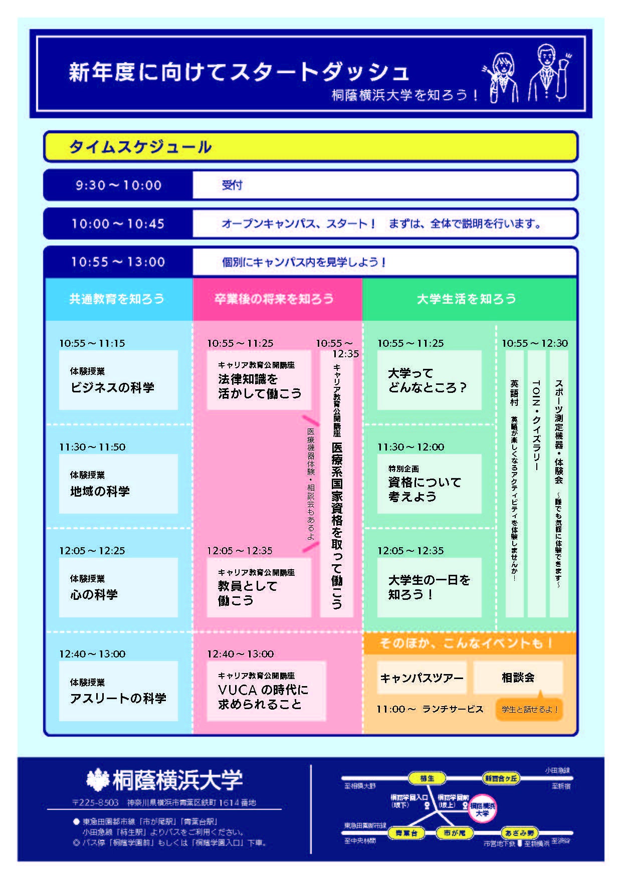 それぞれの企画を通じて、桐蔭横浜大学での学びのこと、大学生活のこと、卒業後の進路のことなどについて理解を深めていただければと思います。