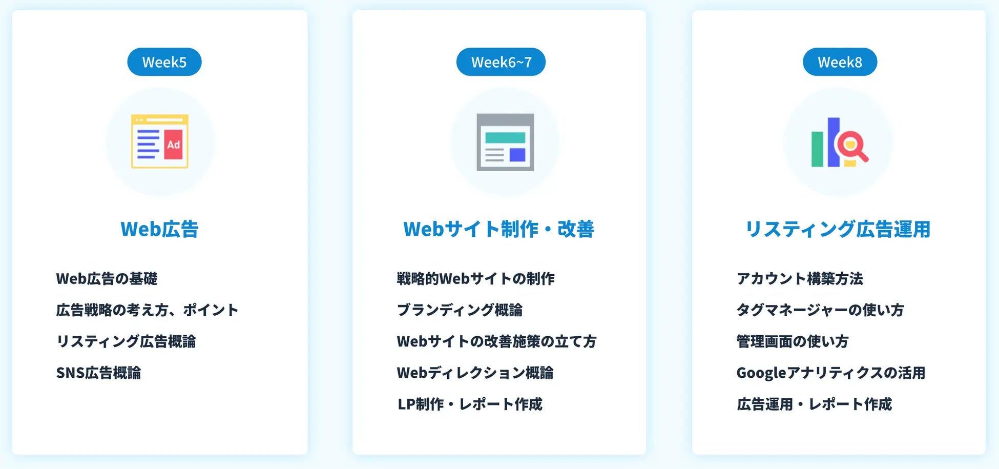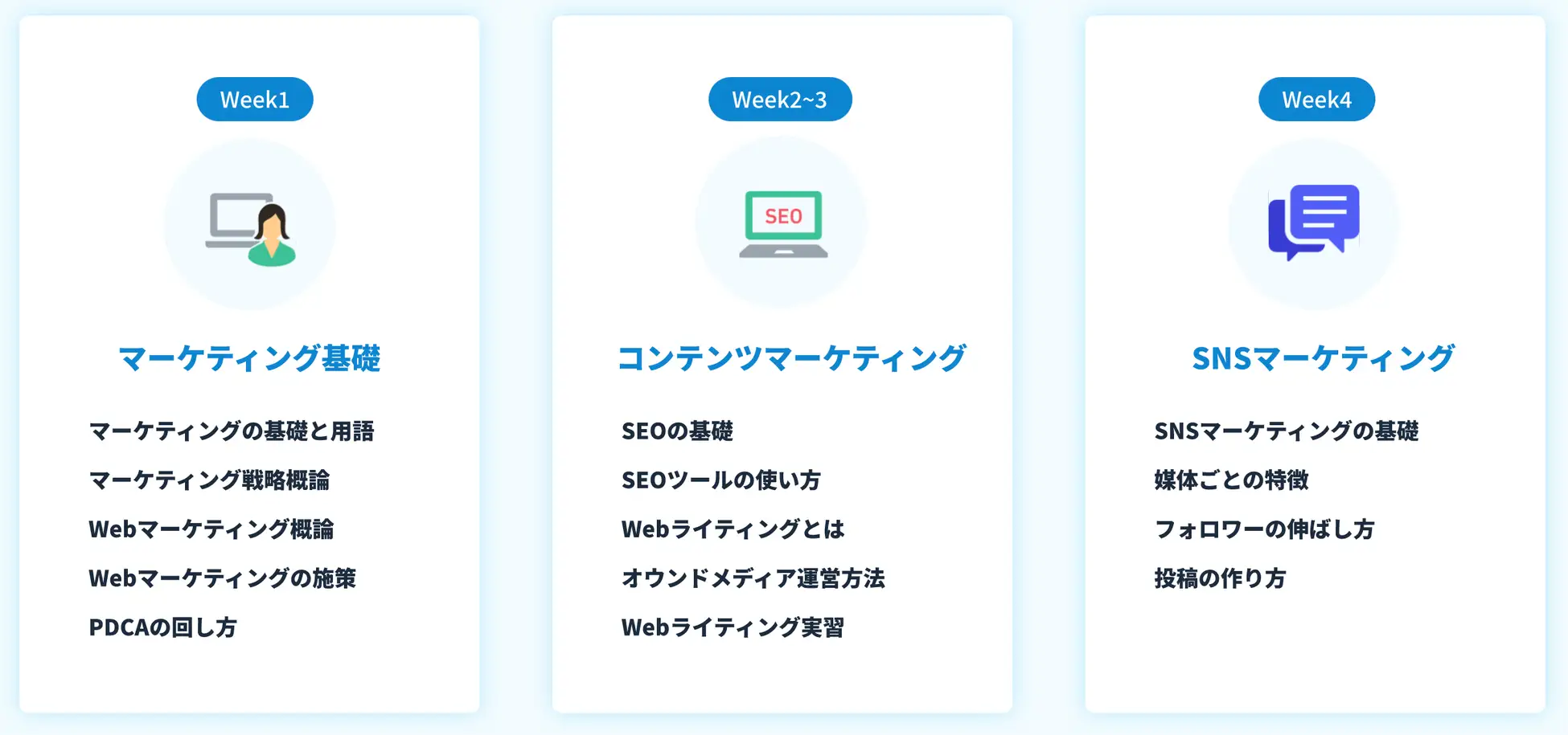 マーケティングの基礎から学び、戦略、コンテンツマーケティング、SEO、SNSマーケティング、Web広告、サイト改善とマーケターに必要な全てを学ぶことができるカリキュラムになっています。