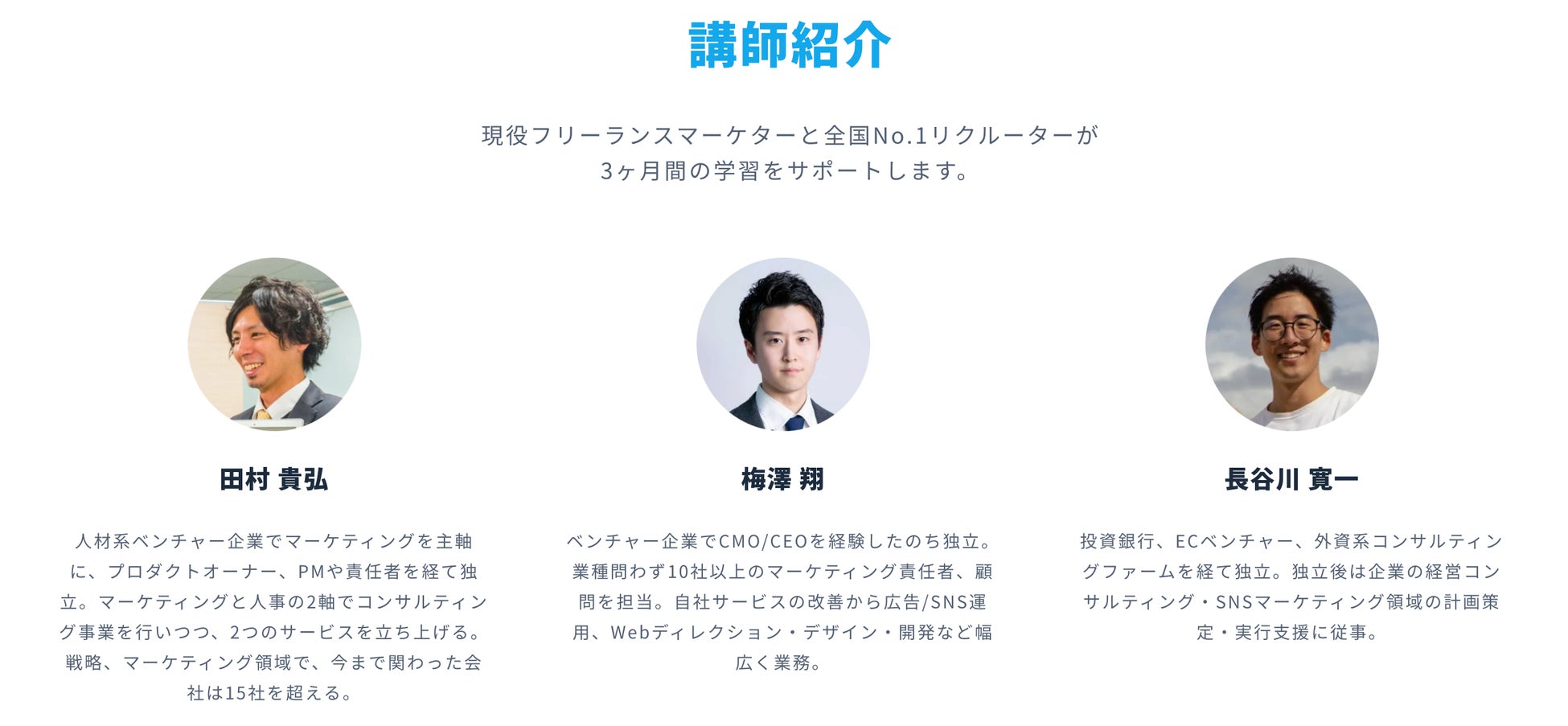 「Be Marketer(Webサイト:https://be-marketer.com)」は、3ヶ月間のカリキュラムで、未経験からWebマーケティング業務による収入が得られるWebマーケターを育成するスクールです。2ヶ月間のオンライン学習でWebマーケティングを網羅的に学習した後に、1ヶ月間Webマーケティングの委託業務を報酬付きで行います。学習と委託業務の遂行を、マーケティングのスキルで独立・起業して活躍している講師が週に1回50分のオンライン面談を通してサポート。また、副業やフリーランス案件を獲得するための営業スキルを身につけるキャリアコンサルティングも同時並行で実施。3ヶ月間でスキルと実務経験、業務実績を得て卒業します。