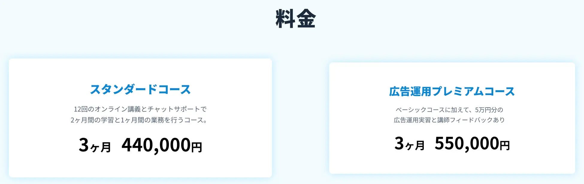 マーケティングの総合的に学ぶことができる「スタンダードコース(受講期間:3ヶ月、受講料:税込440,000円)」と、スタンダードコースのカリキュラムに加えて、広告運用まで学ぶことができる「広告運用プレミアムコース(受講期間:3ヶ月、受講料:550,000円税込)」の2種類を提供します。