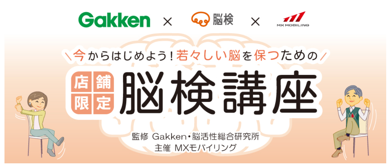 この講座には、認知症の予防に効果的と言われている軽いエクササイズに加え、Gakkenが出版しているドリルや、10分の受検で脳年齢が測れる「脳検」がセットとなっています。今後はMXモバイリングが展開するドコモショップの全国の直営店舗にてさらに拡大予定です。
