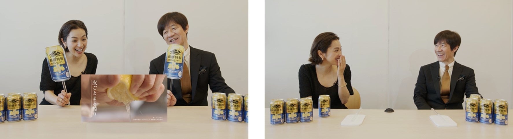 「レモンサワーが飲みたくなる篇」では、「麒麟特製 豊潤レモンサワー」をつくるためのさまざまな手間暇かける工程を、まるで料理をつくるかのようなおいしそうな映像で表現しました。「12時間煮込む」「ひと晩漬け込む」「皮ごとまる搾り」といったレモンのうまさを余すことなく引き出す製法を目の当たりにして、思わずレモンサワーが飲みたくなって待ちきれない様子の中村さんが印象的です。