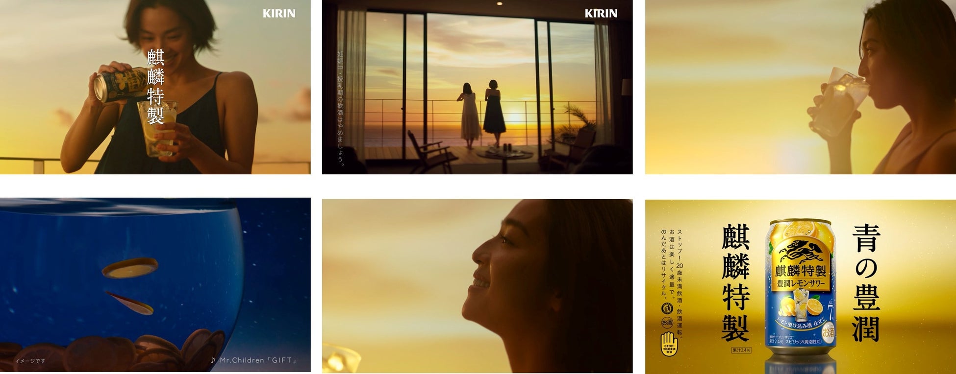 新TVCM「青の豊潤篇」「青の豊潤(特製)篇」は、中村アンさんが出演し、「麒麟特製 豊潤レモンサワー」のおいしさと上質な時間を楽しむ様子を描いたCMとなっています。ひと晩かけてレモンの繊細なうまみがゆっくり溶け出していく様子をドラマティックに映像化し、「麒麟特製 豊潤レモンサワー」の格別なおいしさと、丁寧なお酒づくりで「お客様の今日を、幸せな時間で満たしたい」というブランドの思いを表現しました。楽曲にはMr.Childrenの「GIFT」を使用し、色鮮やかな世界観をより引き立てています。