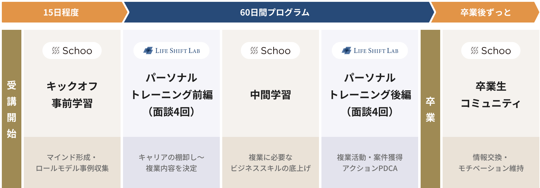 人生後半も活躍し続けたい40~50代のための、複業デビューのパーソナルトレーニングサービスです。人材マーケットに精通するトレーナーがマンツーマンで伴走支援。スクーの豊富な学習コンテンツ・ライフシフトラボの実践的な複業ノウハウを最大限活用しながら、強みの棚卸しから打ち出し方、具体的な案件獲得方法までを体系的に学び実践できる60日のプログラムです。