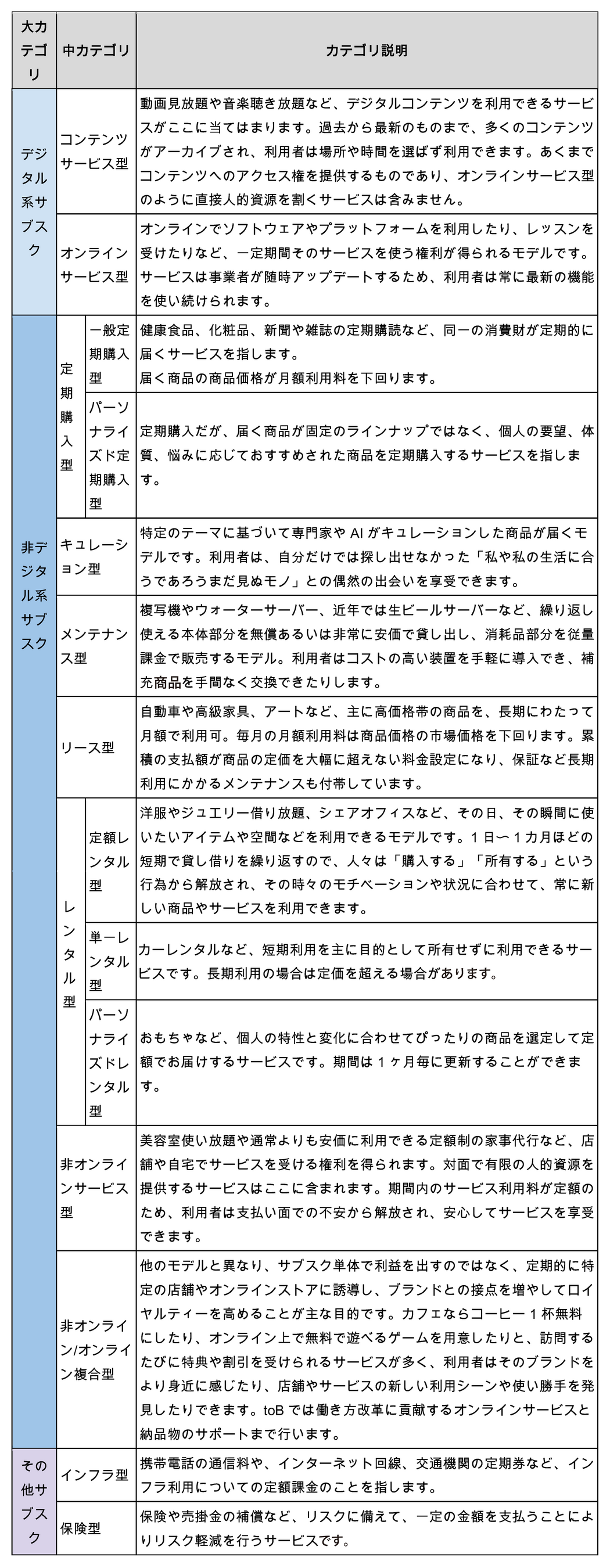 本ガイドライン制定にあたり、一般社団法人日本サブスクリプションビジネス振興会は普及しているサブスクリプション・サービスを調査し、分類をまとめました。