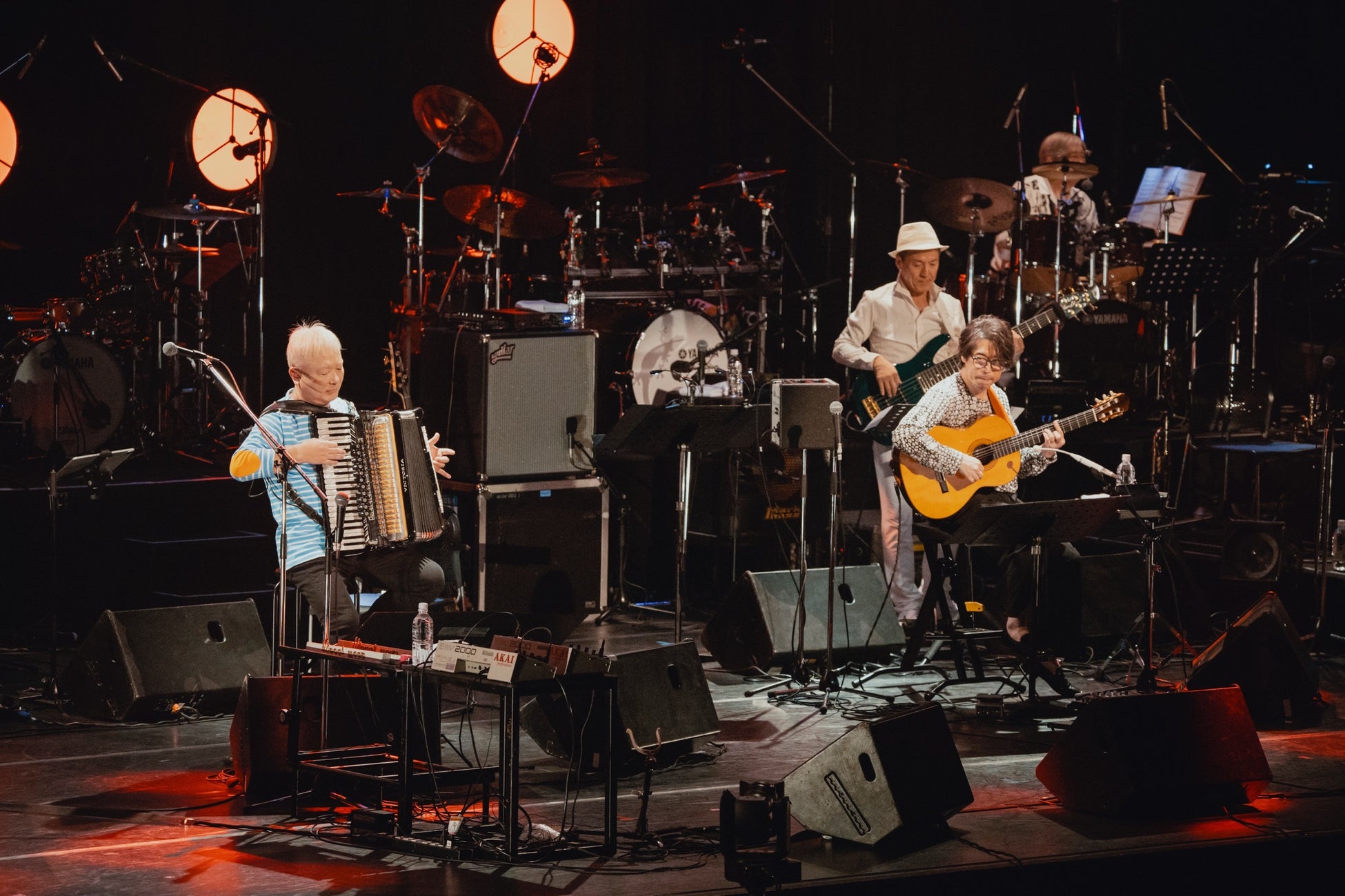 インターミッションを経て始まったのは、cobaのアコーディオン·ソロによる「Campana」。イタリアの名器“ヴィクトリア”から醸し出される香り高い音色が圧巻です。続いてはフラメンコ·ギター奏者、沖仁のソロによる「フエゴ~炎~」。楽器の前に1本のマイクを立てただけの、ピックアップもアンプも用いない、粒立ちのよいアコースティック·ギターの音色が場内を満たします。ふたりは2022年からcokibaというユニットを組んでいますが、cobaのアルバム『サムライ アコーディオン』では渡辺香津美とのコラボレーションで演奏されていた「Crimson Strings」が、この日、cobaと沖仁の超絶的なパフォーマンスで味わえたのも大きな収穫でした。さらに「時間のプロフィール」では仙波清彦がドラマーとして参加、そこに櫻井哲夫が加わった4人編成ではアストル·ピアソラの「リベルタンゴ」、cokibaの代表的ナンバー「悲しみの神-proserpina-」の2曲が取り上げられました。
