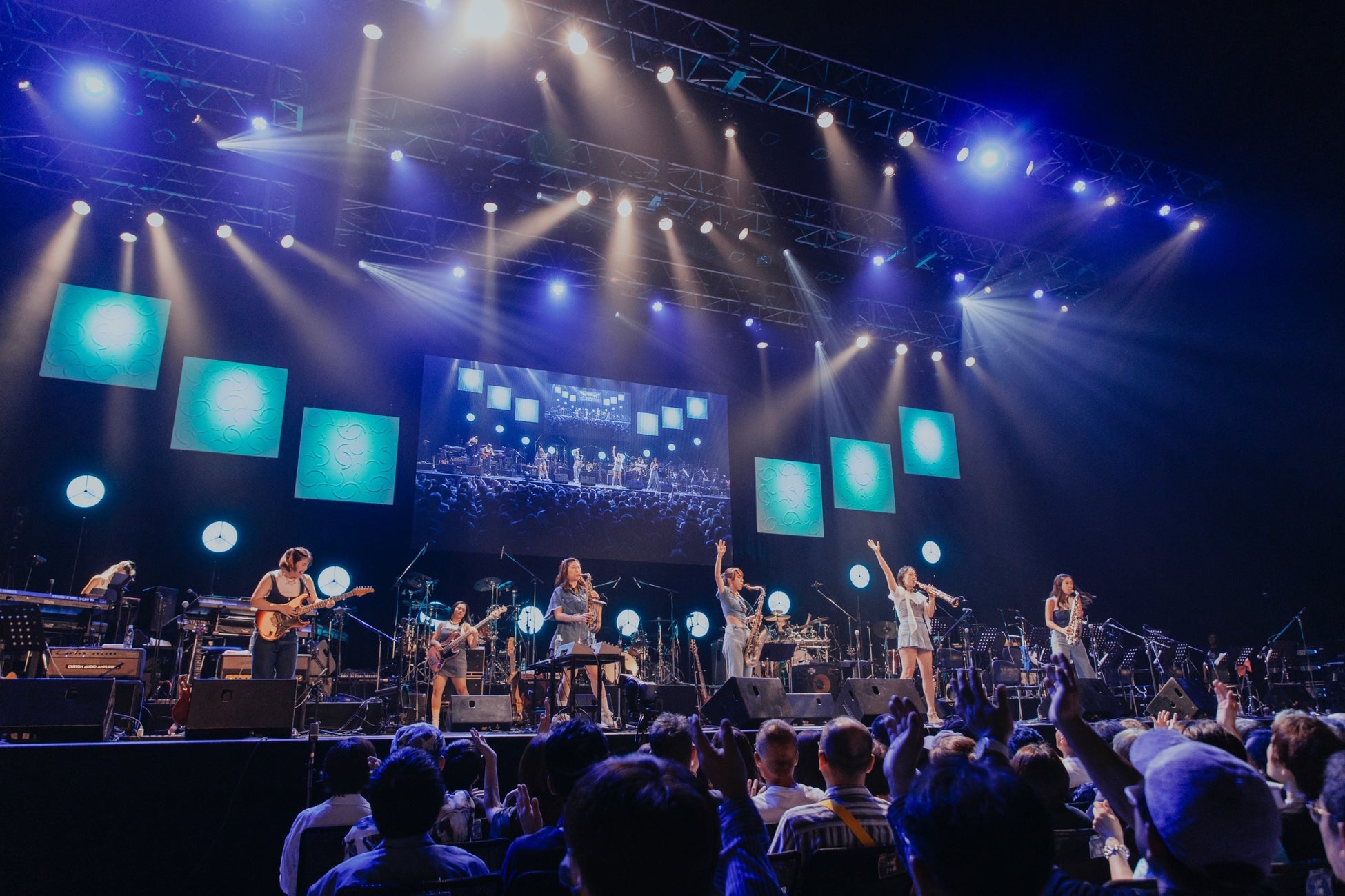 オープニングを飾ったのはTHE JAZZ AVENGERS。ドラマーの川口千里の呼びかけで2021年に結成された8人組です。セットリストは「Exploration」、「8 STEPS」、「As You Like」など、この5月にリリースされたばかりの最新アルバム『8 STEPS』からのものが中心。広いステージをフルに使ったパフォーマンスと親しみやすい曲調の相乗効果で、出だしの一音から会場を大いに沸かせてくれます。川口、キーボードの竹田麻里絵、ギターの瀬川千鶴、芹田珠奈のベースからなるコンビネーションは抜群の安定感を持ちつつも華やか、ソプラノ·サックス(中園亜美)、アルト·サックス(寺地美穂、WaKaNa)、テナー・サックス(米澤美玖)によるフロント陣もアンサンブルとソロの双方で輝きを放ち、「As You Like」における観客とのコール&レスポンスも強く印象に残りました。