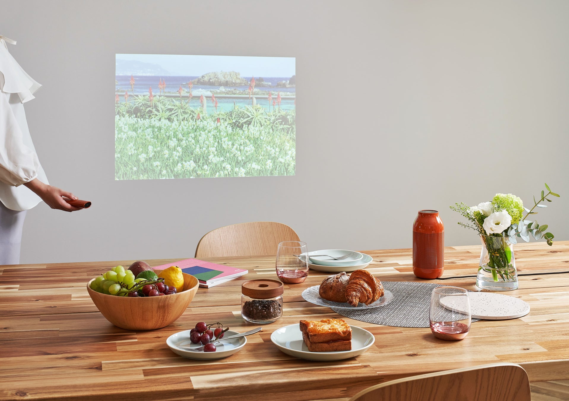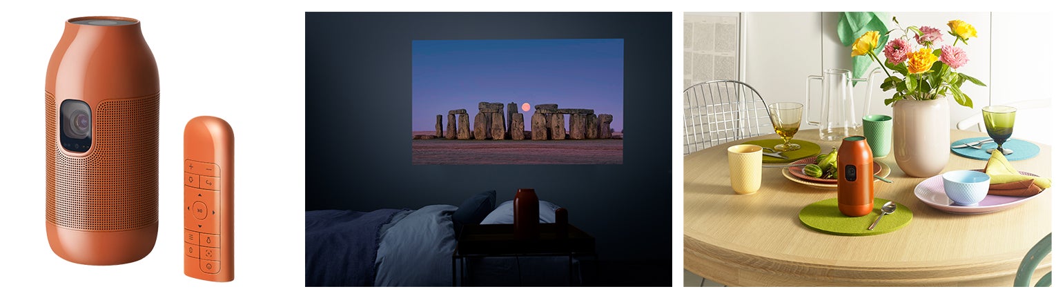 Aladdin Vaseは、インテリアに調和する花瓶のような形状で、あえてアクセントになりそうな強いカラーリングをセレクトしたおしゃれなデザインの見せ家電です。置き場所に困らないコンパクトなサイズながら、100インチの迫力ある投影機能がある本格的なプロジェクターだからこそ、誰もが気軽に使えます。