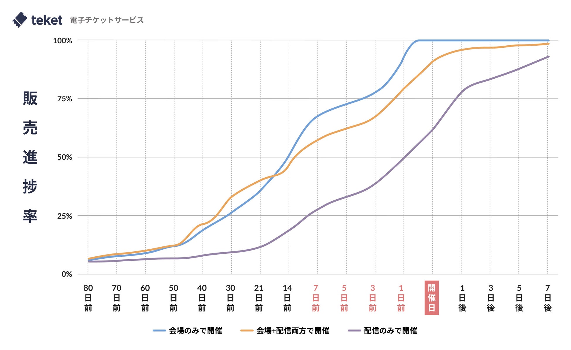 ・ライブ配信チケットは前日までが約5割、当日に約7割に。配信開始から1週間(アーカイブ配信)で約9割まで伸びる