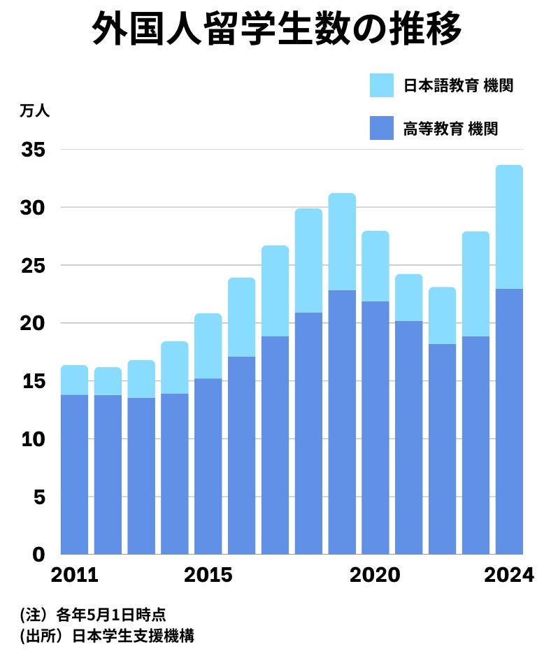 日本で学ぶ外国人留学生の数は年々増加しており、文部科学省の発表によると、2024年度時点で33万6,708人(前年比21%増)に達している(※日本経済新聞記事参照)。
