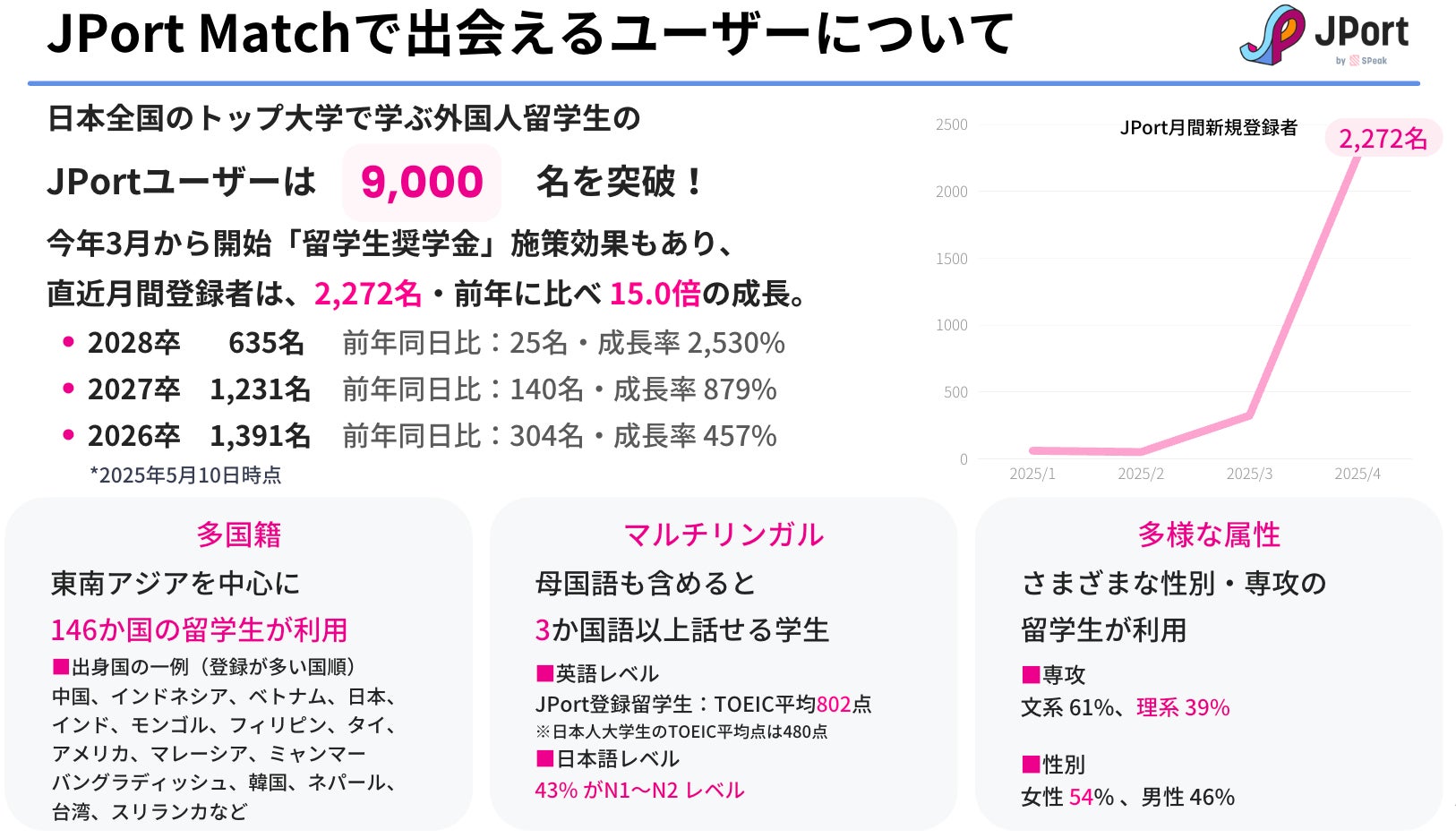 また、本奨学金のシステムとして、当社のグローバル採用広報プラットフォーム、JPort Matchを通しての応募となった。日本全国のトップ大学で学ぶ外国人留学生のJPortユーザーは9000名を突破し、直近月間登録者は、2,272名・前年に比べ 15倍の成長を見せた。