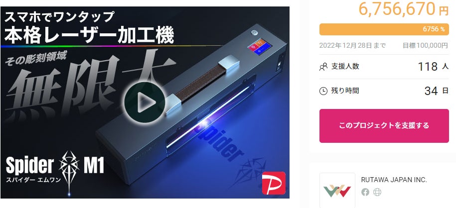 ルタワジャパン株式会社(本社:大阪府大阪市)は、2022年11月24日、レーザー加工機『Spider M1』がGREEN FUNDINGにて支援総額670万円を達成しましたことをお知らせします。