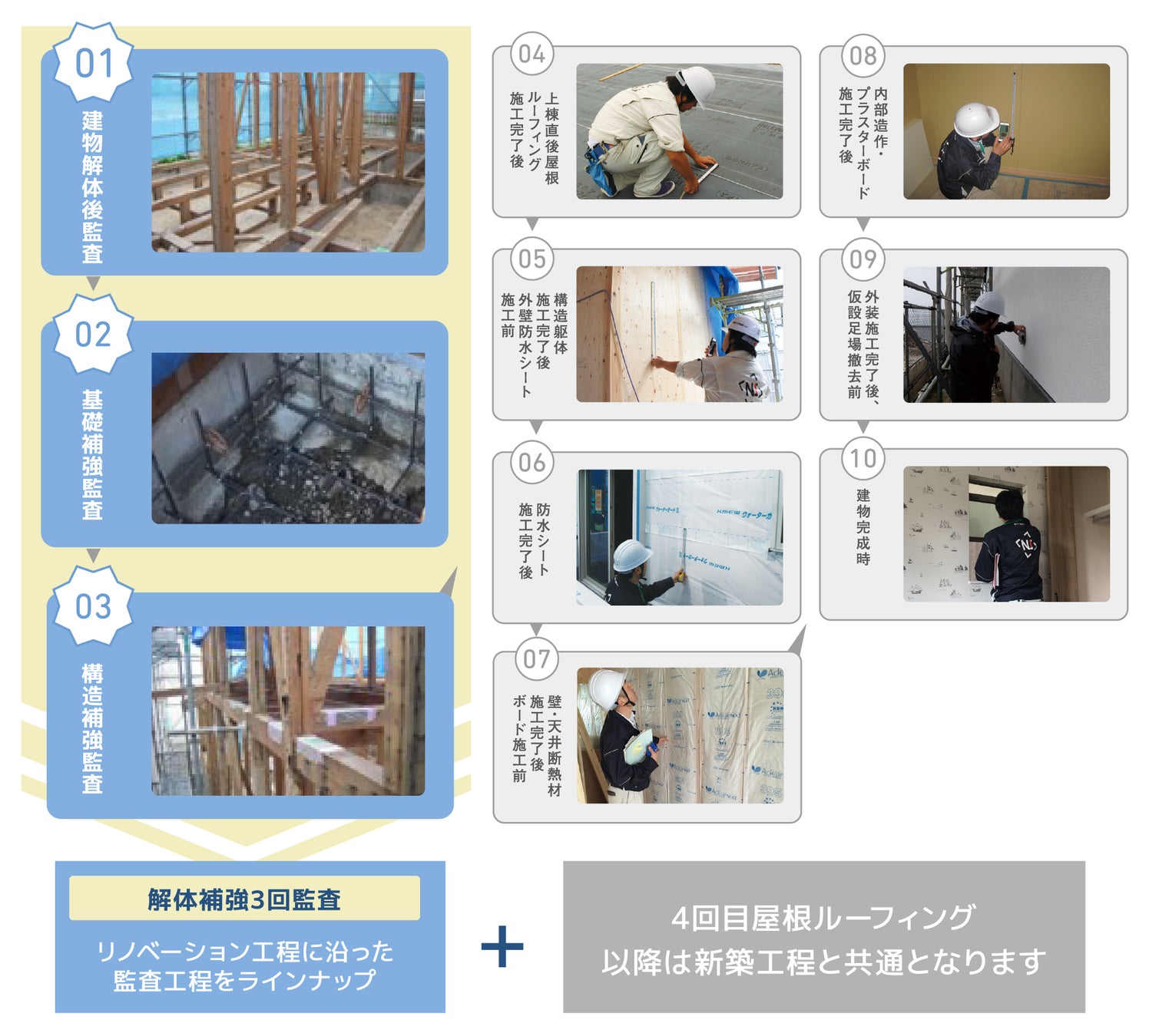 このサービスは、木造住宅のリノベーション工事において、施工管理工程の中で後戻りができない10の重要なタイミングを節目に、第三者の視点で観察・評価するものです。スコアリングと評価分析を行うことで、自社の施工品質を改善・向上させるだけでなく、ナレッジ化によって情報共有や知識・ノウハウの標準化が図れます。これにより、人材育成に大いに役立つだけではなく、お施主様に対しても、施工品質の信頼性と安心感を高めることができます。