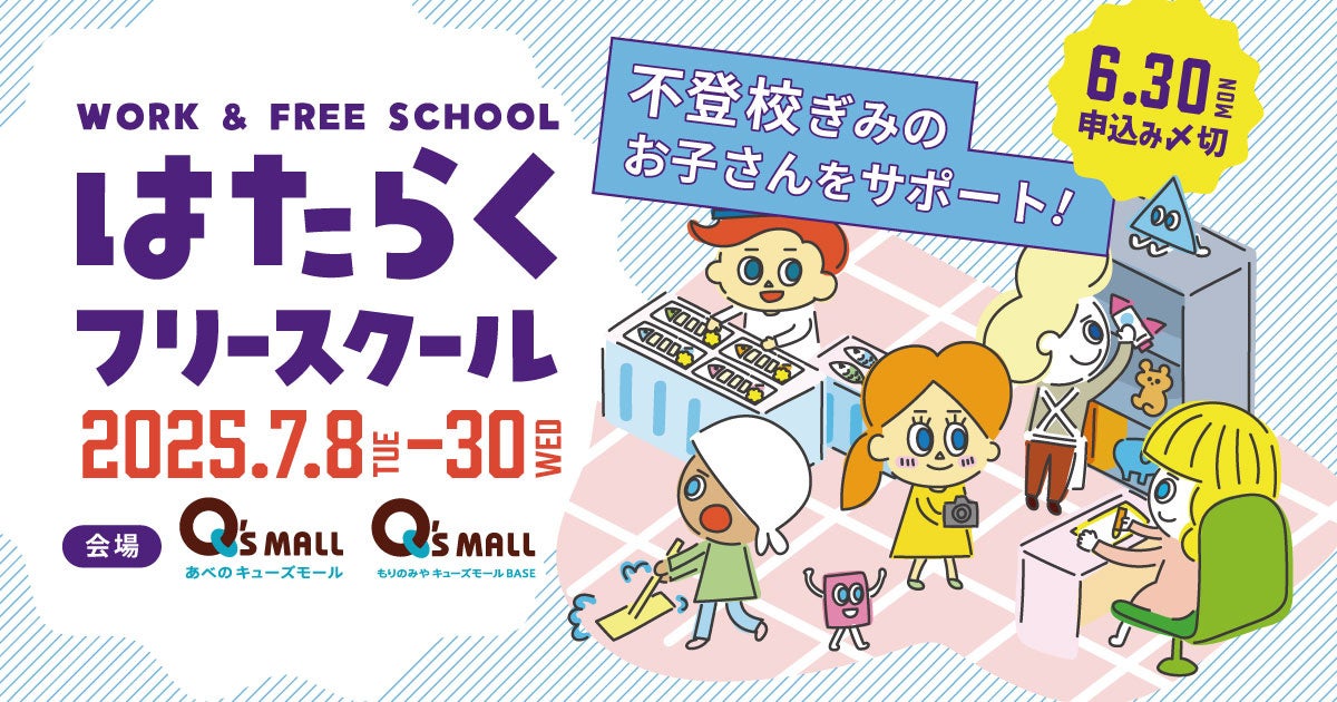 NPO法人HELLOlife(大阪・西区)は、東急不動産株式会社および東急不動産SCマネジメント(あべのキューズモール・もりのみやキューズモールBASE)の協力、日本財団の助成により、7月8日(火)からの1ヶ月間、不登校児童生徒向け職場体験プログラム「はたらくフリースクール」をあべのキューズモール・もりのみやキューズモールBASEで実施致します。 |