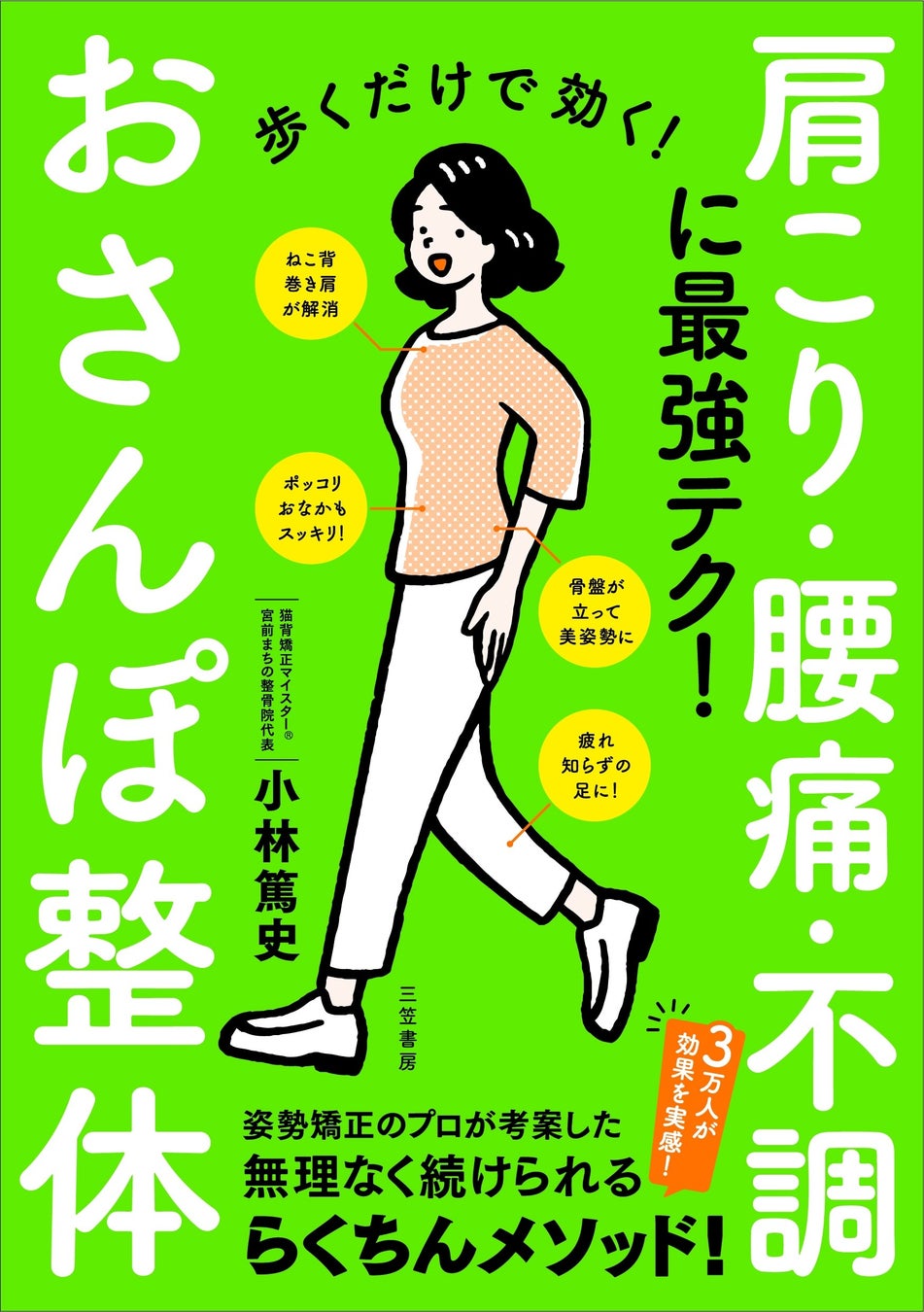 私、小林篤史(猫背矯正マイスター®︎・宮前まちの整骨院代表)の著書『歩くだけで効く!おさんぽ整体』(三笠書房より5月26日発売)では、たった3分工夫して歩くだけで、腰痛、肩こりなどの不調、そして女性が気になる「ぽっこりお腹」にも効く方法を紹介しています。