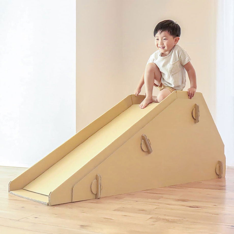 製品は子どもたちの創造力を引き出すため、あえて色や柄を加えずダンボール本来の風合いを活かした仕様としています。また、特殊素材ではなく一般的なダンボールを用いることで、柔らかく温かみがありながら、親子で使用できる十分な強度を実現。実際に、すべり台は約200名規模の保育園で8カ月以上使用できた実績もあり、安全性と耐久性を備えています。
